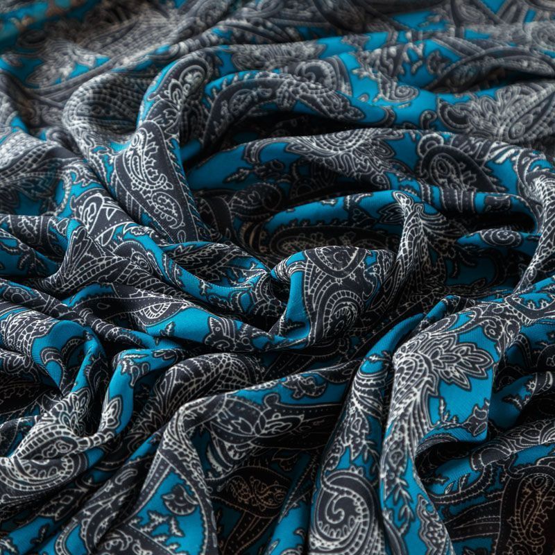 Шифон синего оттенка с черно-белым принтом пейсли. Струящийся, летящий, воздушный, полупрозрачный. На ощупь мягкий и приятный. Подойдет для пошива тончайших воздушных блуз, изумительных платьев со сборками и воланами и элегантных шарфов.