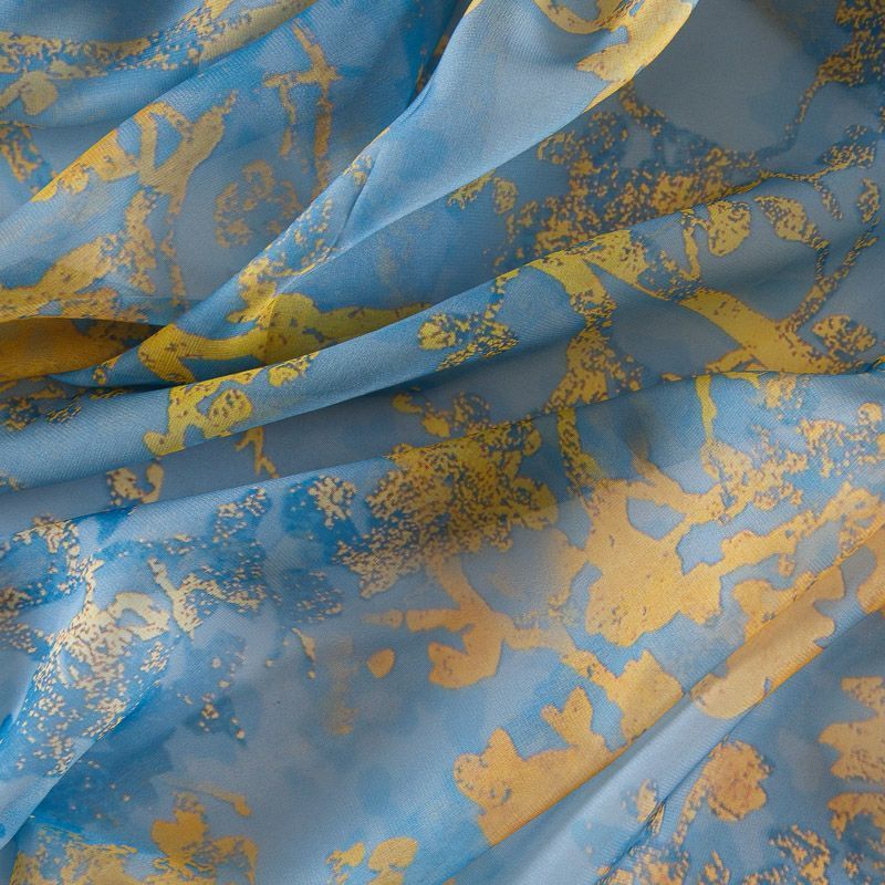 Воздушный, летящий, эффектный шифон в желто-голубых оттенкахс абстрактным принтом. Ткань матовая, мягкая, пластичная, не тянется, достаточно прозрачная, не статичная. Подойдет для пошива фееричного платья, сарафана, туники, блузки, пляжной одежды.
