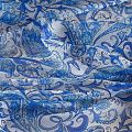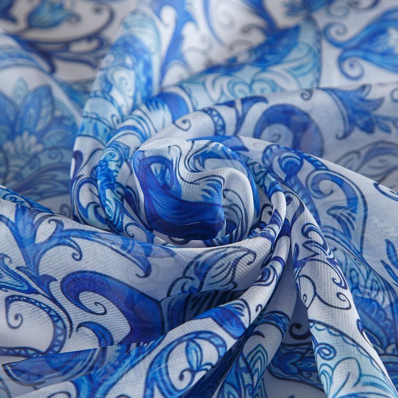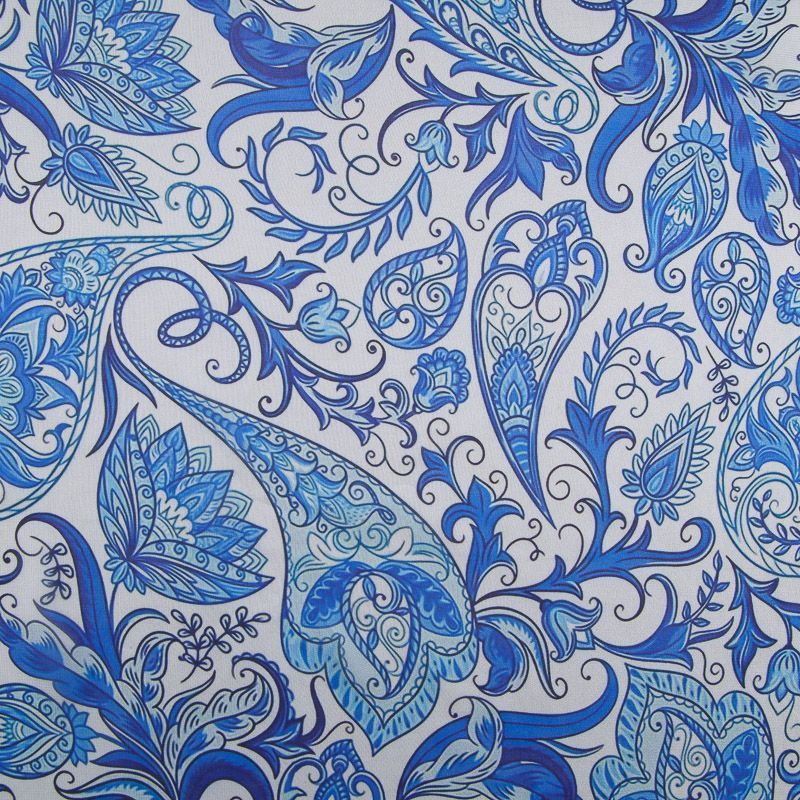 Воздушный, летящий, эффектный шифон в бело-голубых оттенках с принтом пейсли. Ткань матовая, мягкая, пластичная, не тянется, достаточно прозрачная, не статичная. Подойдет для пошива фееричного платья, сарафана, туники, блузки, пляжной одежды.