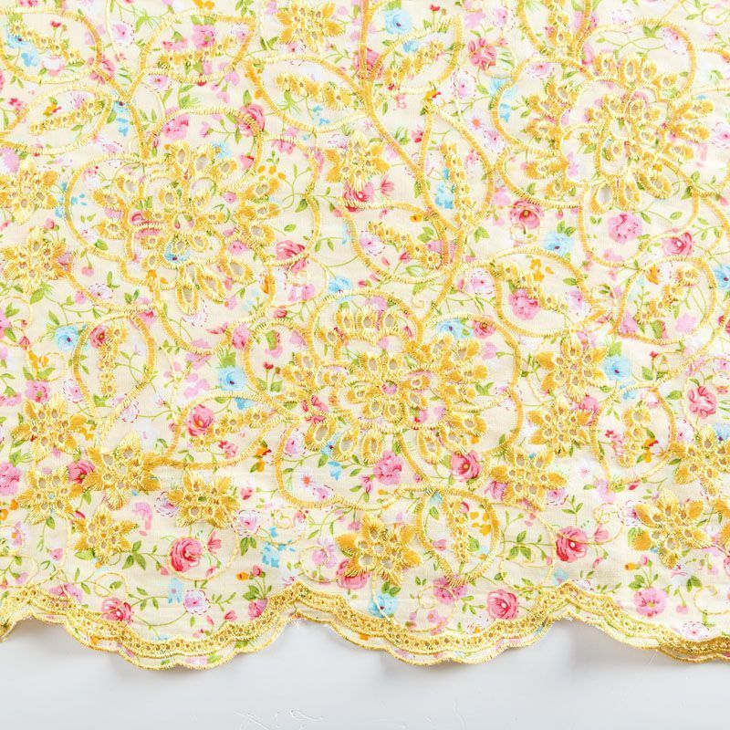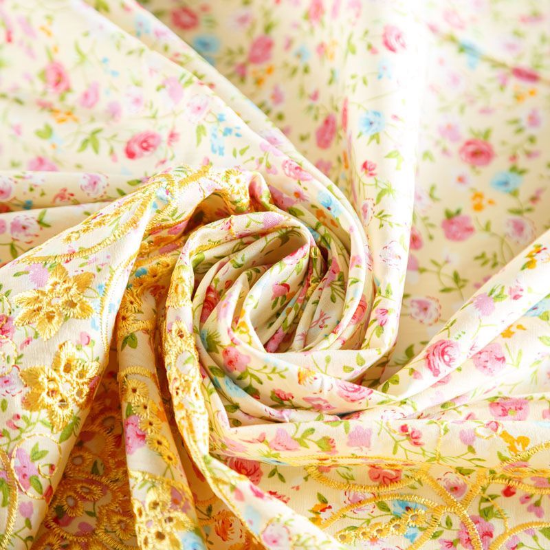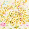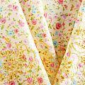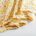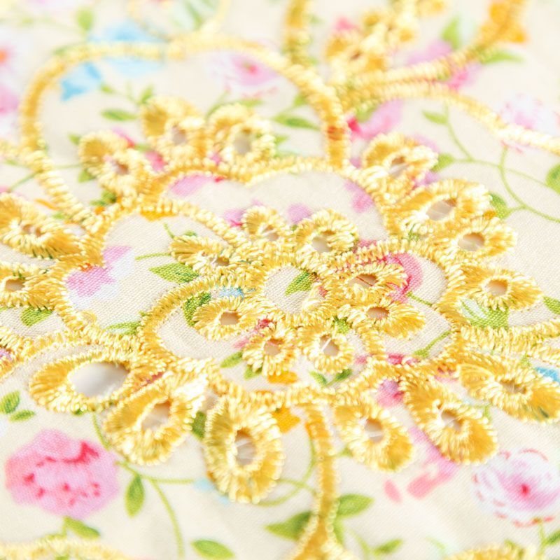 Мягкий и нежный хлопок выбеленного желтого оттенка с мелким романтичным цветочным принтом украшен изящной вышивкой и перфорацией.  Узор выполнен путём машинной вышивки нитками в цвет ткани и расположен вдоль одной кромки, поэтому набирается на изделие объемом. Ткань тонкая, легкая, не сухая, имеет тенденцию к сминаемости, не много просвечивает, не тянется, приятная на ощупь. Идеально подходит для создания летних платьев, сарафанов, юбок, блузок, топов, шорт.