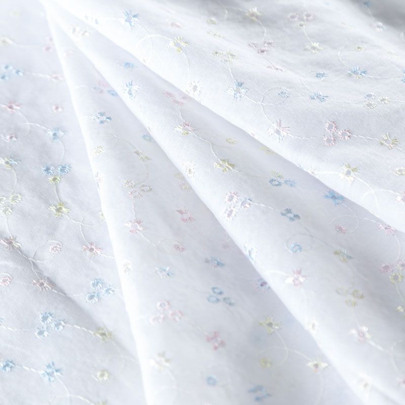 Мягкий и нежный хлопок белоснежного оттенка с вышивкой и перфорацией. Узор выполнен путём машинной вышивки разноцветными нитками и расположен по всему полотну. Фактура ткани однородная, имеет тенденцию к сминаемости, не тянется, приятная на ощупь. Может потребоваться подклад. Идеально подходит для создания летних платьев, сарафанов, юбок, блузок и топов.