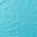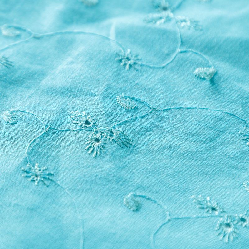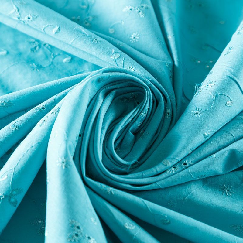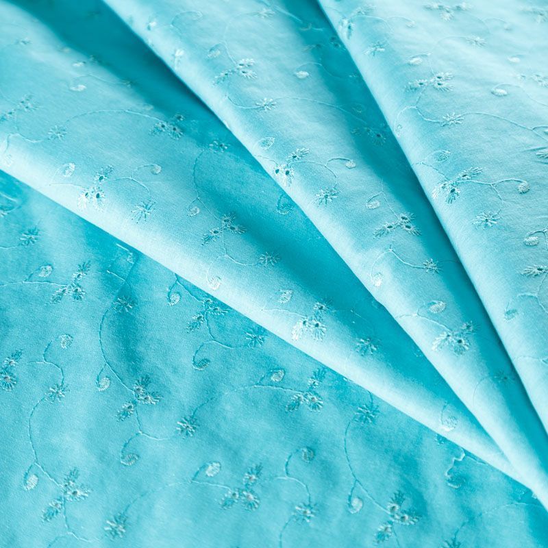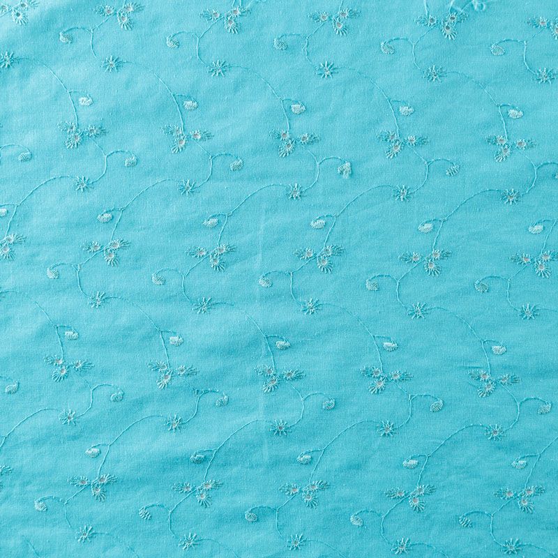 Мягкий и нежный хлопок бирюзового оттенка с вышивкой и перфорацией. Узор выполнен путём машинной вышивки нитками в цвет ткани и расположен по всему полотну. Фактура ткани однородная, имеет тенденцию к сминаемости, не тянется, приятная на ощупь. Может потребоваться подклад. Идеально подходит для создания летних платьев, сарафанов, юбок, блузок и топов.