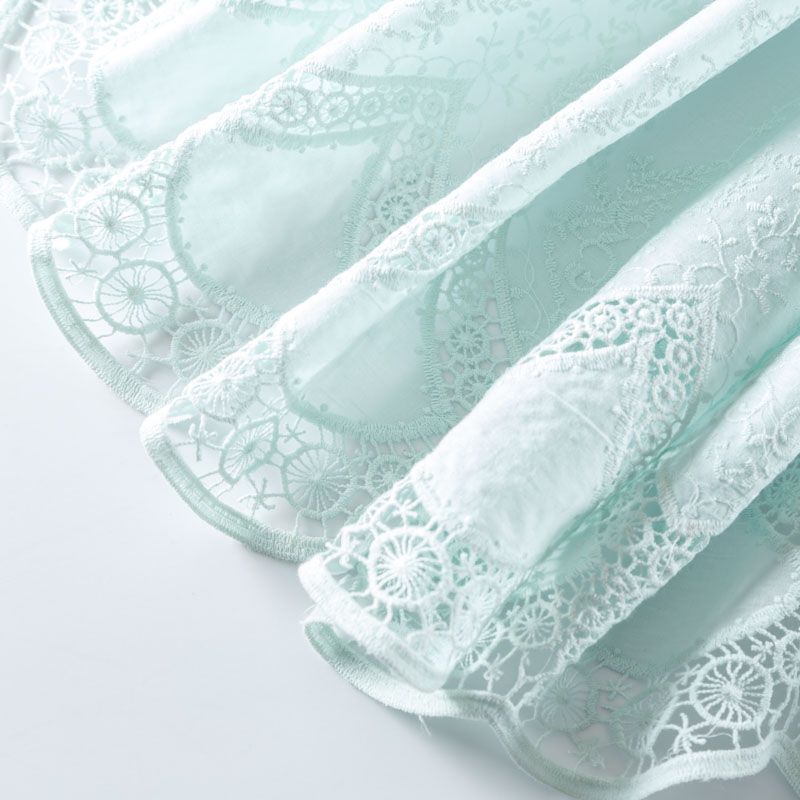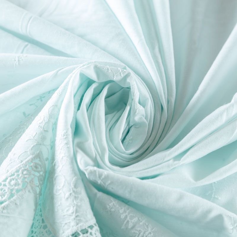 Мягкий и нежный хлопок мятного оттенка с изящной вышивкой. Узор выполнен путём машинной ажурной вышивки "ришелье" нитками в цвет ткани и расположен вдоль кромки. Фактура ткани однородная, имеет тенденцию к сминаемости, просвечивает, не тянется, приятная на ощупь. Идеально подходит для создания летних платьев, сарафанов, юбок, блузок и топов.