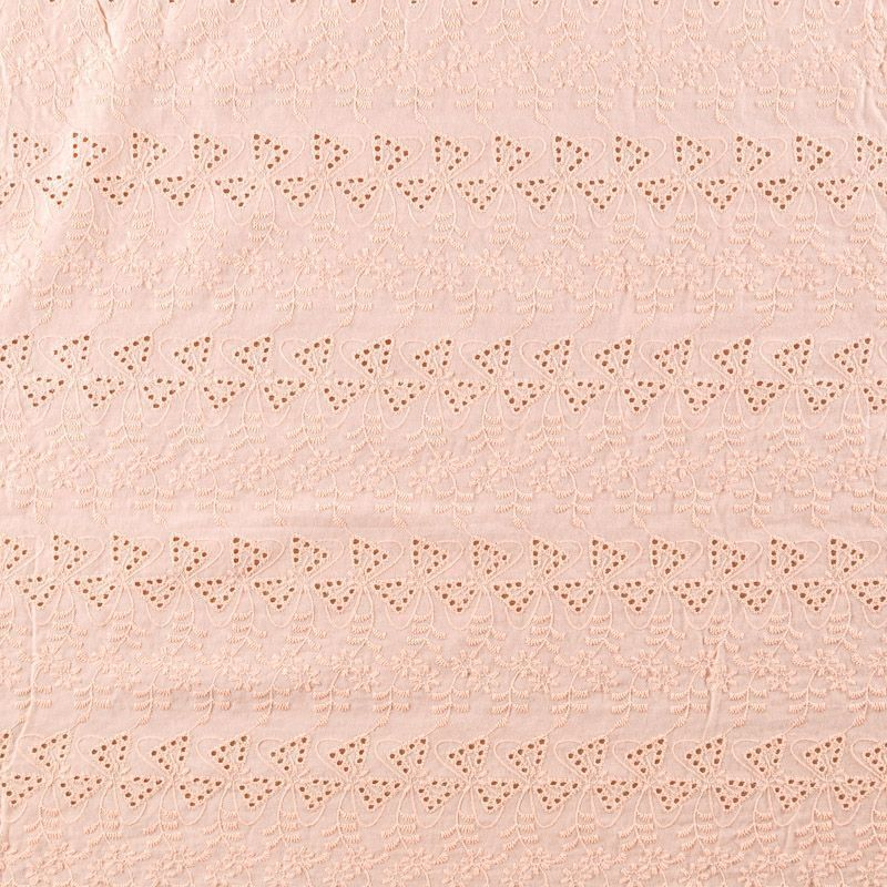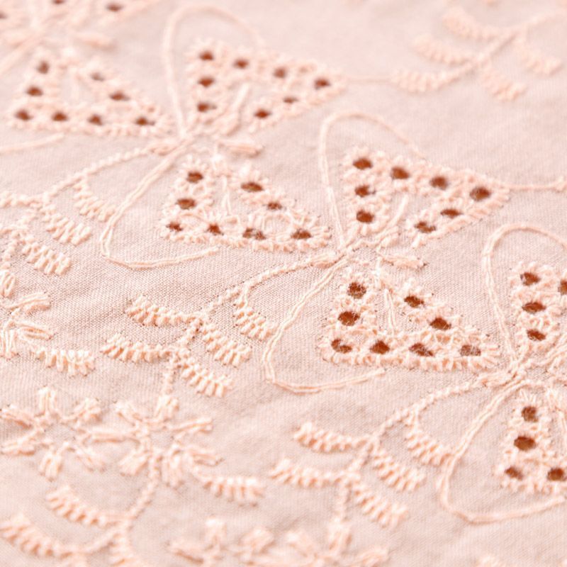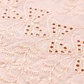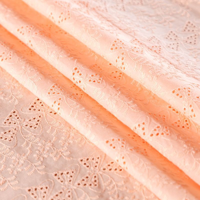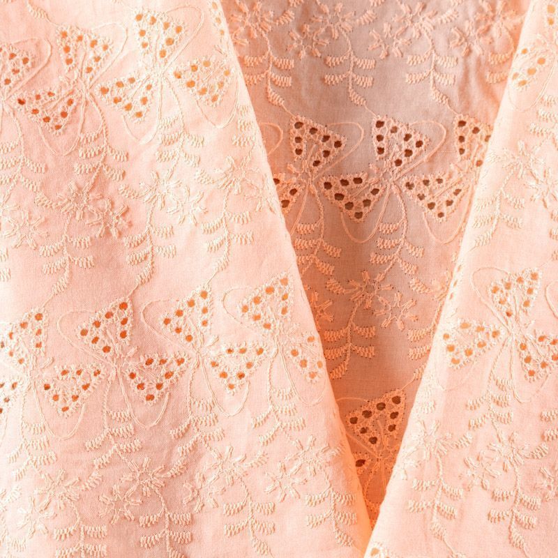 Мягкий и нежный хлопок персикового оттенка с вышивкой и перфорацией. Узор выполнен путём машинной вышивки нитками в цвет ткани и расположен по всему полотну, обе кромки оформлены фестонами. Фактура ткани однородная, имеет тенденцию к сминаемости, не тянется, приятная на ощупь. Может потребоваться подклад. Идеально подходит для создания летних платьев, сарафанов, юбок, блузок и топов.