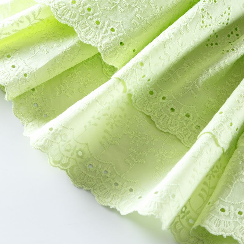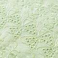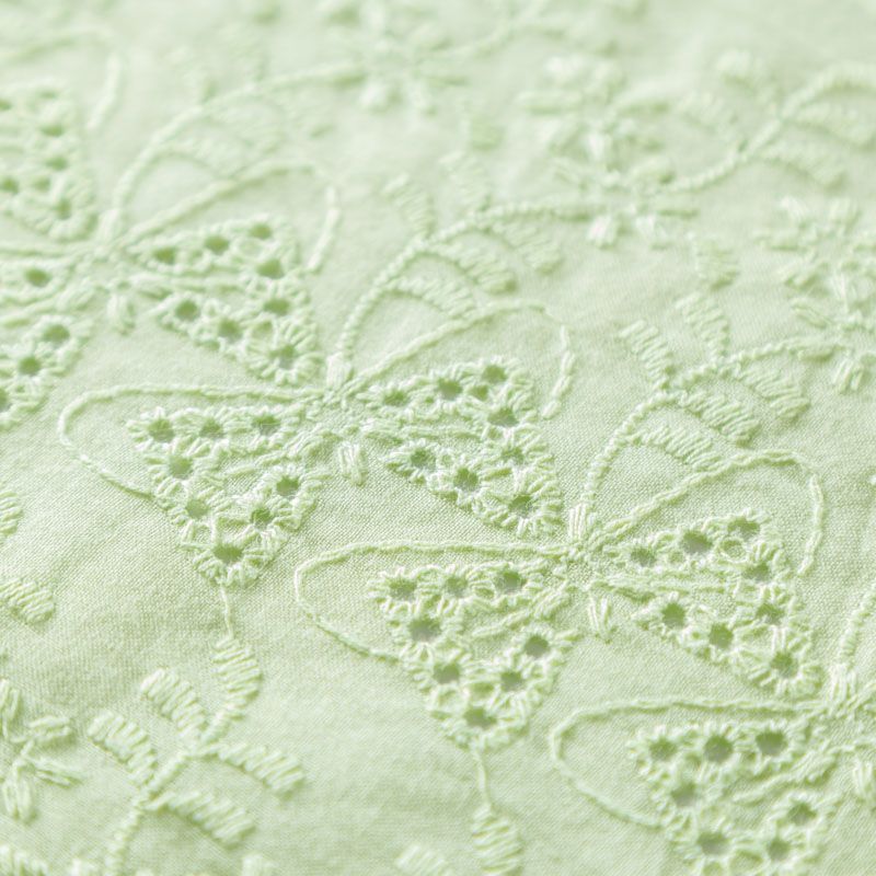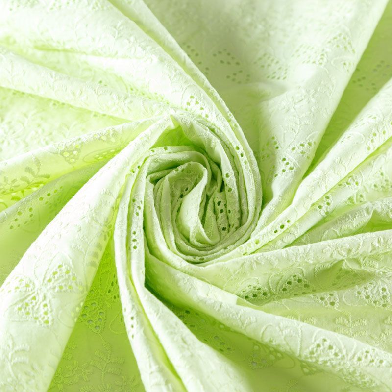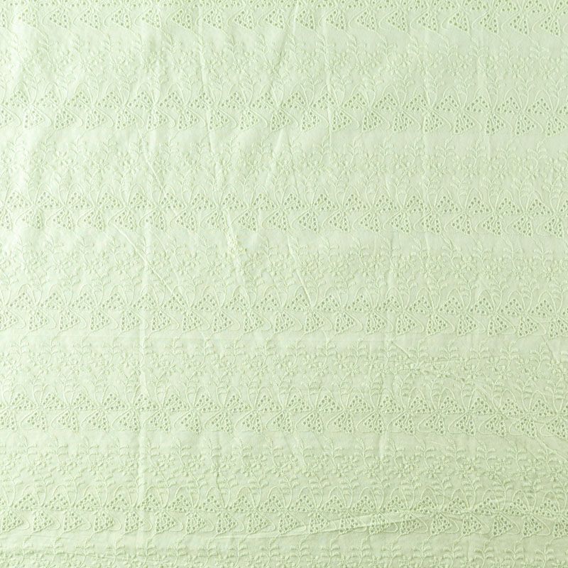 Мягкий и нежный хлопок салатового оттенка с вышивкой и перфорацией. Узор выполнен путём машинной вышивки нитками в цвет ткани и расположен по всему полотну, обе кромки оформлены фестонами. Фактура ткани однородная, имеет тенденцию к сминаемости, не тянется, приятная на ощупь. Может потребоваться подклад. Идеально подходит для создания летних платьев, сарафанов, юбок, блузок и топов.