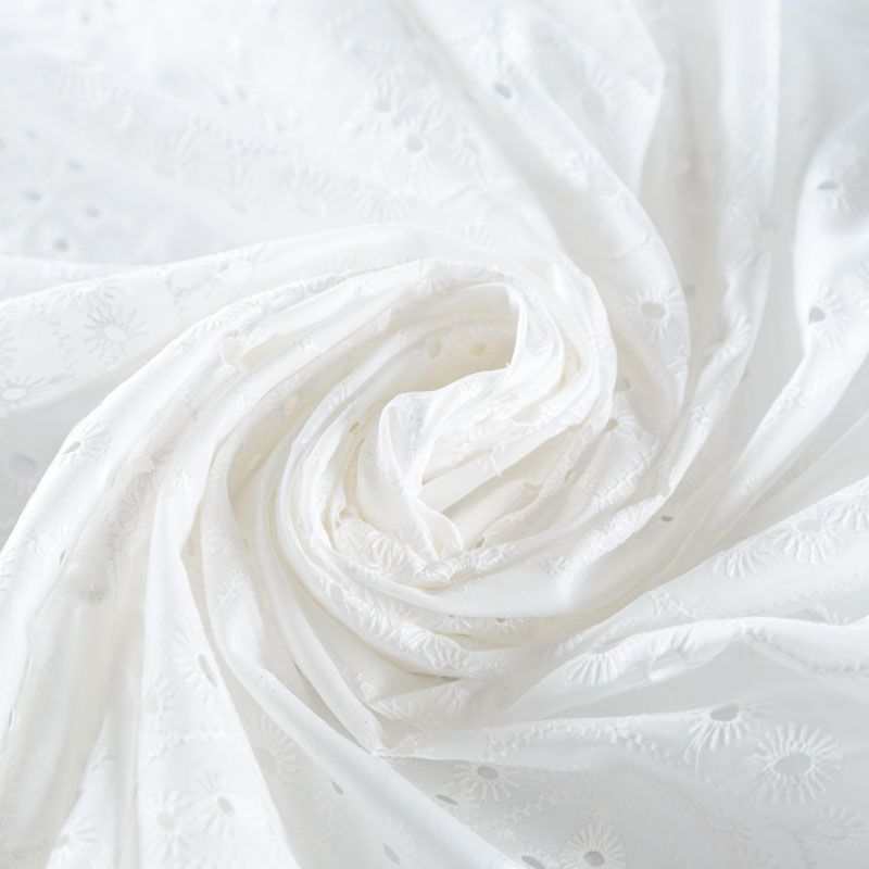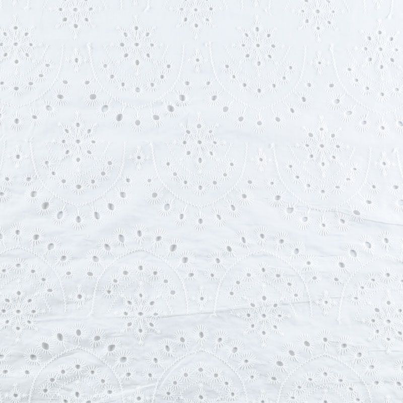 Итальянское шитье на белоснежной хлопковой основе с геометрической, элегантной вышивкой, расположеннной по всему полотну. Ткань мягкая, легкая, пластичная, приятная на ощупь, просвечивает, потребуется подклад. Обе кромки ткани оформлены фигурными фестонами. Идеально подойдет для пошива рубашки, блузы, топа в воланами, туники, платья, сарафана, юбки, шорт.
