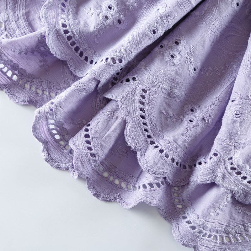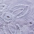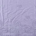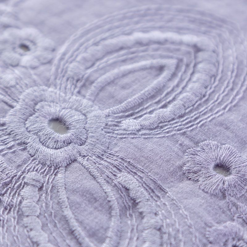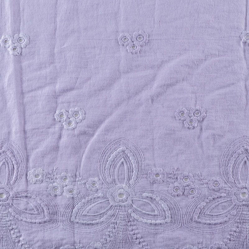 Итальянский мягкий и нежный хлопок трендового фиолетового оттенка с изящной вышивкой. Узор выполнен путём машинной ажурной вышивки нитками в цвет ткани и расположен вдоль кромки. Обе кромки ткани оформлены фигурными фестонами. Фактура ткани однородная, имеет тенденцию к сминаемости, немного просвечивает, не тянется, приятная на ощупь. Идеально подходит для создания летних платьев, сарафанов, юбок, блузок и топов.