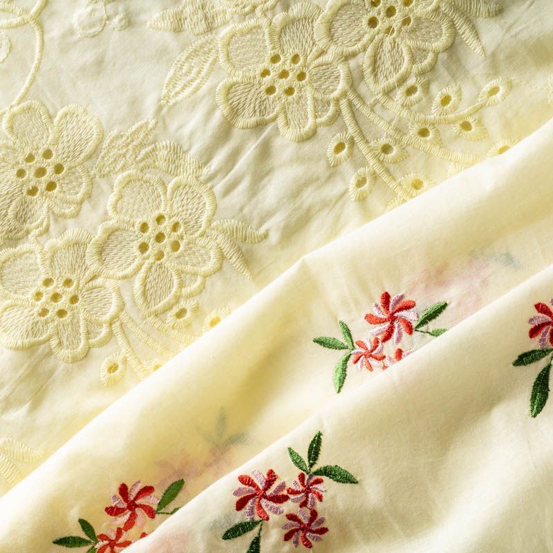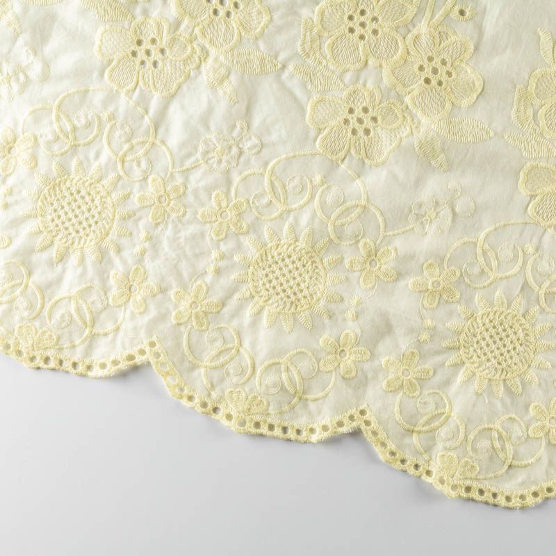 Мягкий хлопок желтого оттенка с яркой цветочной вышивкой. Фактура ткани гладкая, имеет тенденцию к сминаемости, немного просвечивает, не тянется, приятная на ощупь. Хлопок прекрасно пропускает воздух, идеально подходит для создания летних платьев, сарафанов, юбок, блузок и топов. Ткань идет купоном (каймой) вдоль одной кромки. Купон выполнен путём машинной вышивки нитками в цвет ткани. Набирается объемом.