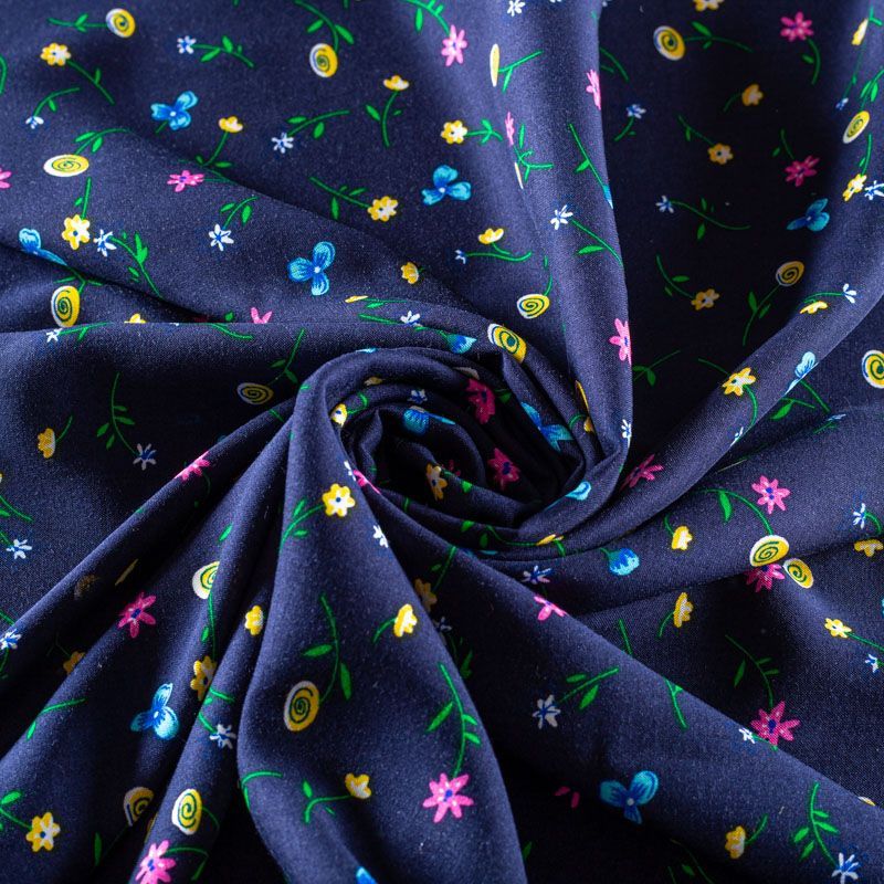 Итальянский плательно-блузочный штапель с мелким цветочным принтом на темно-синем фоне. Мягкий, тонкий, нежный, пластичный, приятный на ощупь, хорошо драпируется, практичный. Подойдет для пошива платья, топа, блузки, рубашки, юбки, летних брюк.
