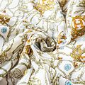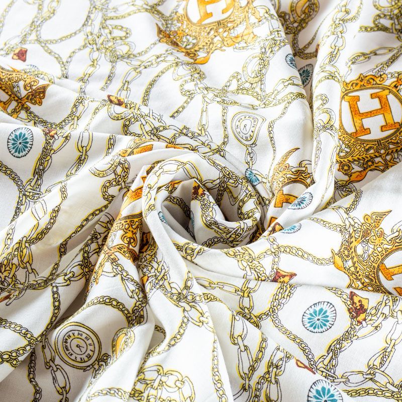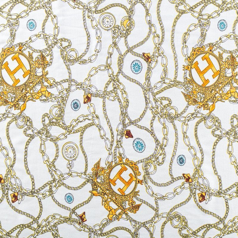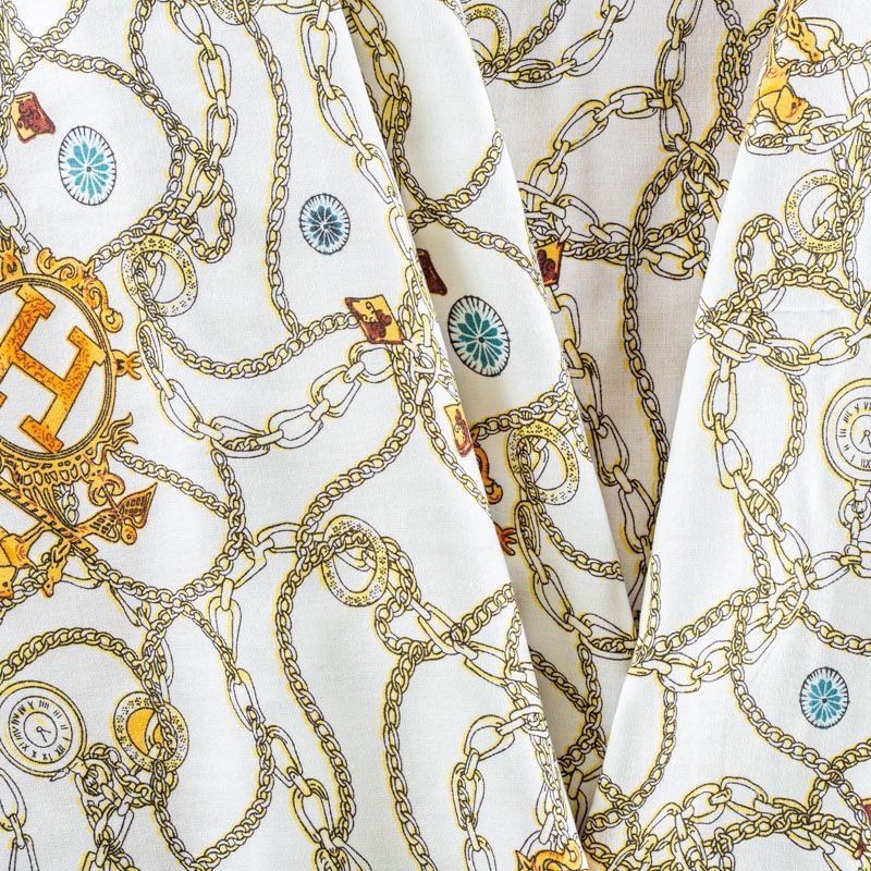 Плательно-блузочный штапель молочного оттенка с многочисленными золотыми цепями, часами и украшениями. Ткань мягкая, тонкая, нежная, пластичная, приятная на ощупь, хорошо драпируется, практичная, поверхность слегка фактурная. Подойдет для пошива платья, топа, блузки, рубашки, юбки, летних брюк.