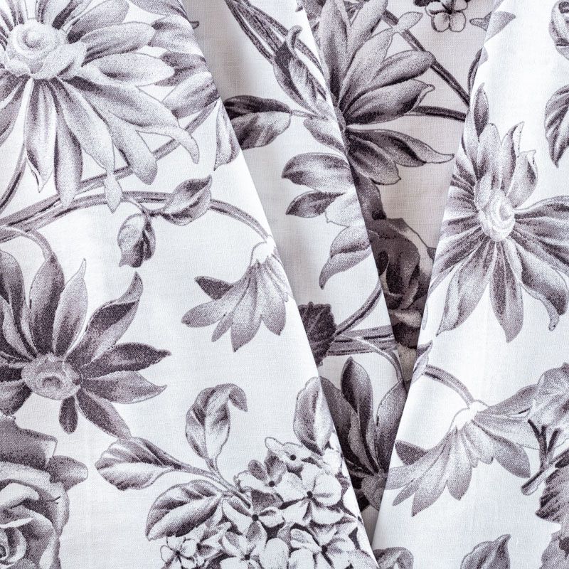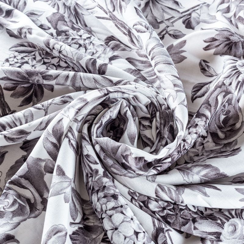 Плательно-блузочный штапель с реалистичным монохромным цветочным принтом на белом фоне. Мягкий, тонкий, нежный, пластичный, приятный на ощупь, хорошо драпируется, практичный. Подойдет для пошива платья, топа, блузки, рубашки, юбки, летних брюк.
