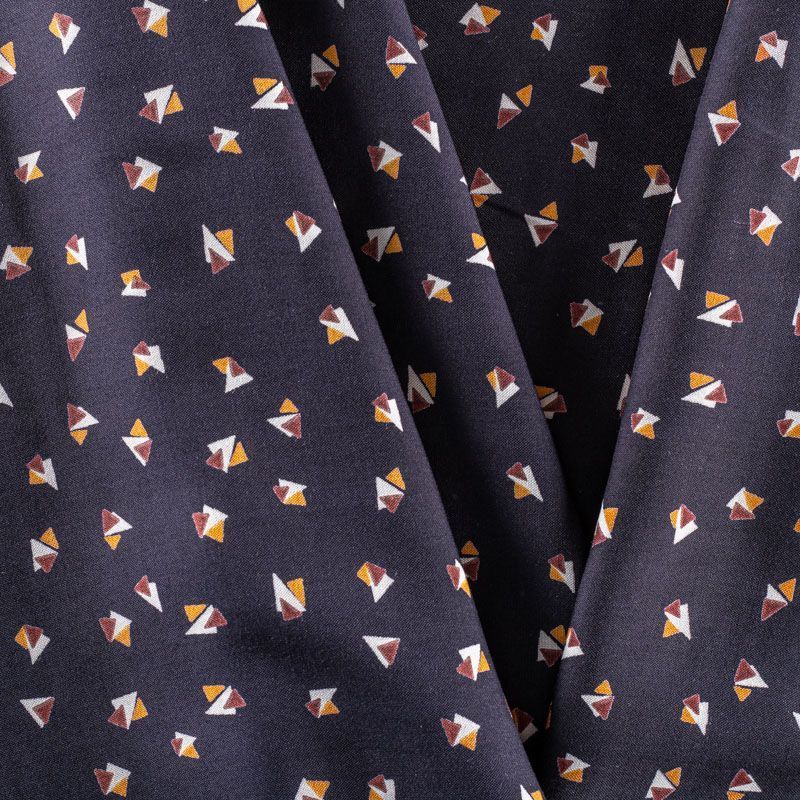 Плательно-блузочный штапель с мелким геометрическим принтом на темно-синем фоне. Мягкий, тонкий, нежный, пластичный, приятный на ощупь, хорошо драпируется, практичный. Подойдет для пошива платья, топа, блузки, рубашки, юбки, летних брюк.