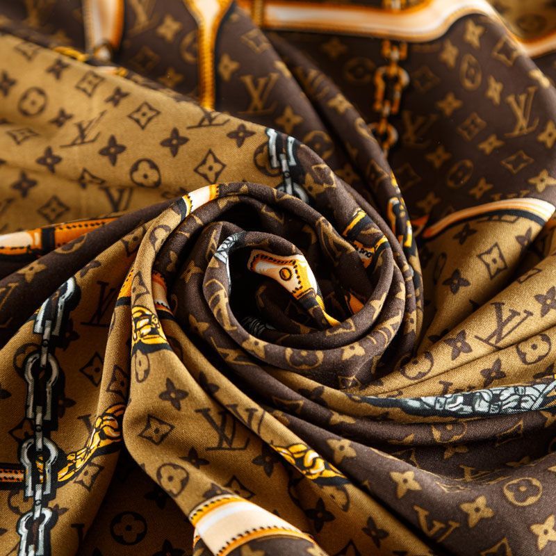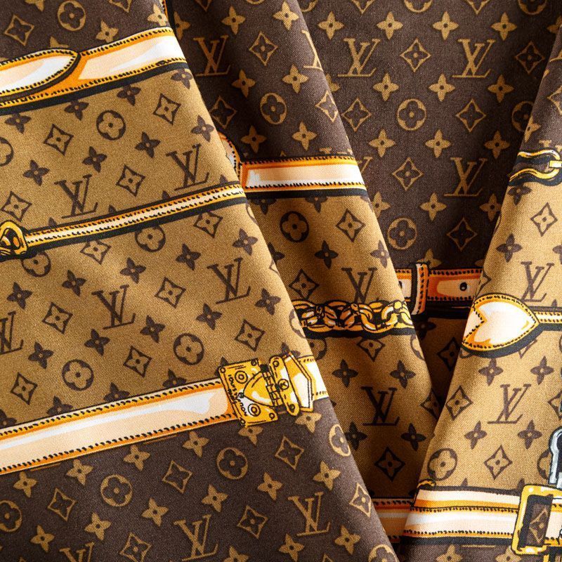 Плательно-блузочный штапель с принтом лого известного бренда в бежево-коричневых тонах. Материал мягкий, тонкий, нежный, пластичный, приятный на ощупь, хорошо драпируется, практичный. Подойдет для пошива платья сарафана, топа, блузки, рубашки, юбки, летних брюк, комбинезона, а также домашней одежды.