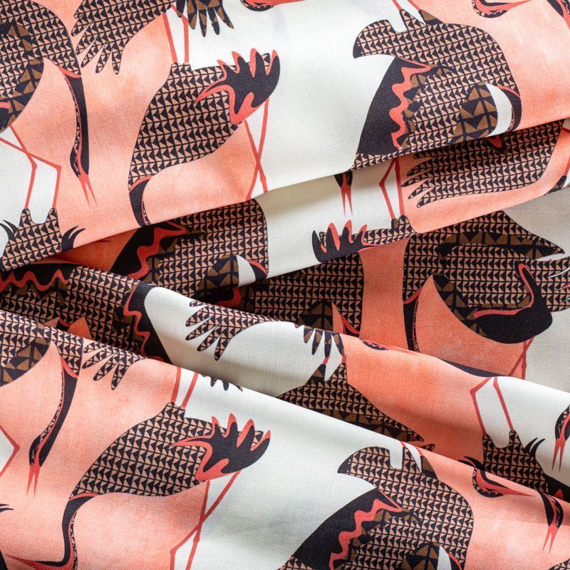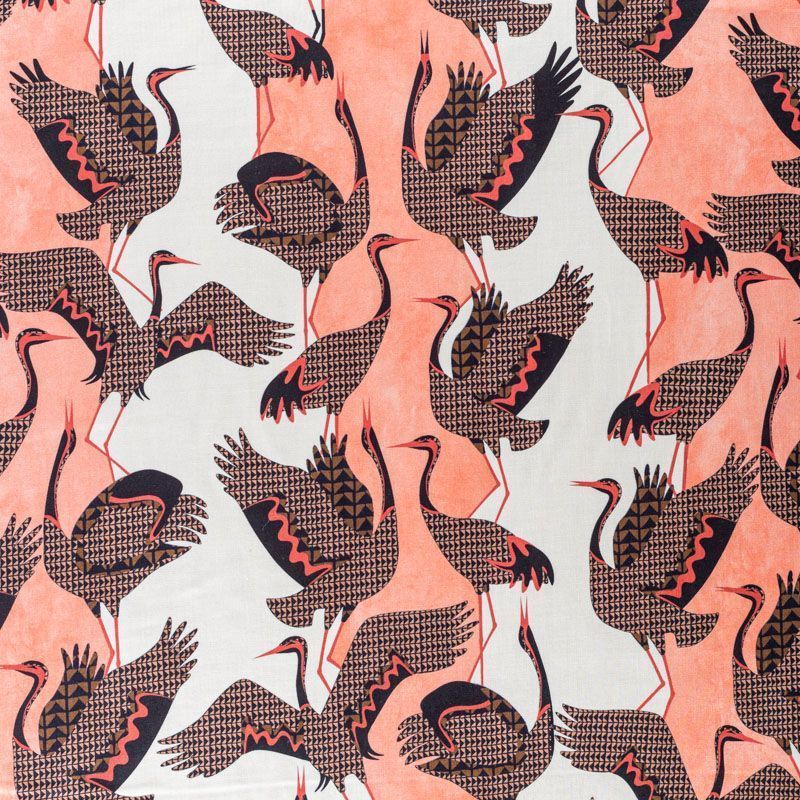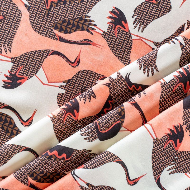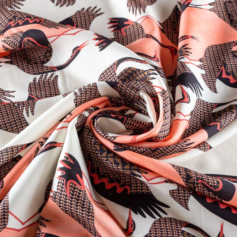 Плательно-блузочный штапель со стилизованными журавлями на молочно-коралловом фоне. Мягкий, тонкий, нежный, пластичный, приятный на ощупь, хорошо драпируется, практичный. Подойдет для пошива платья, топа, блузки, рубашки, юбки, летних брюк.