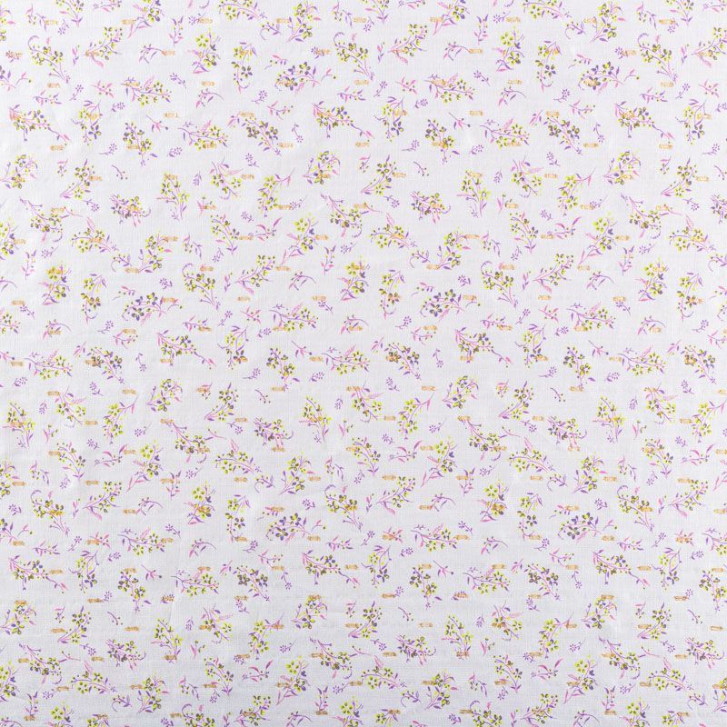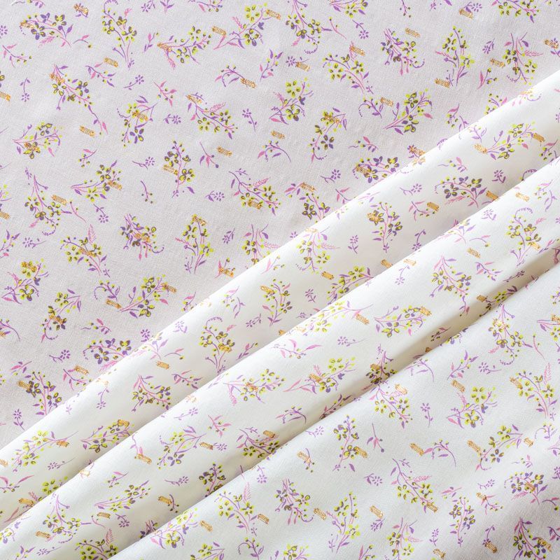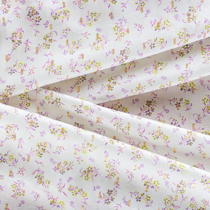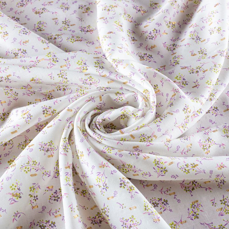 Плательно-блузочный штапель с мелким цветочным принтом на молочном фоне декорирован ресничками из люрексовой нити. Мягкий, тонкий, нежный, пластичный, приятный на ощупь, не много просвечивает, хорошо драпируется, практичный. Подойдет для пошива платья, топа, блузки, рубашки, юбки, летних брюк.