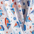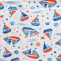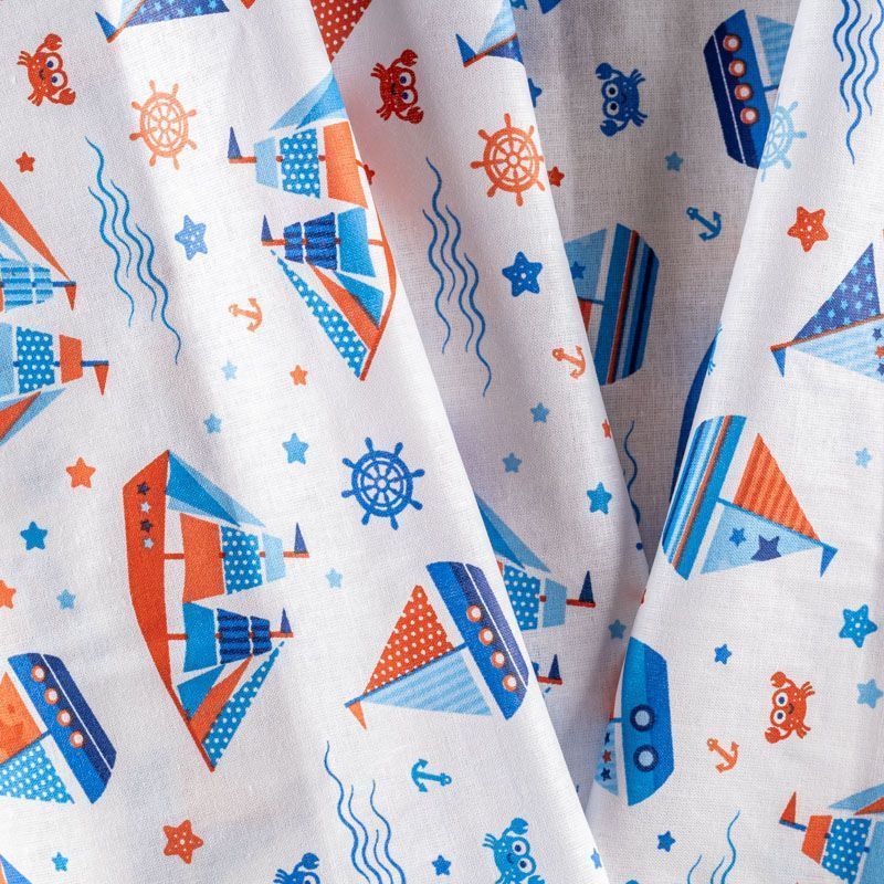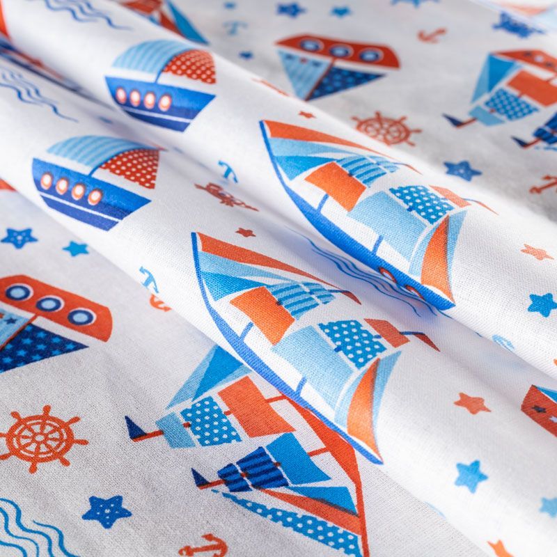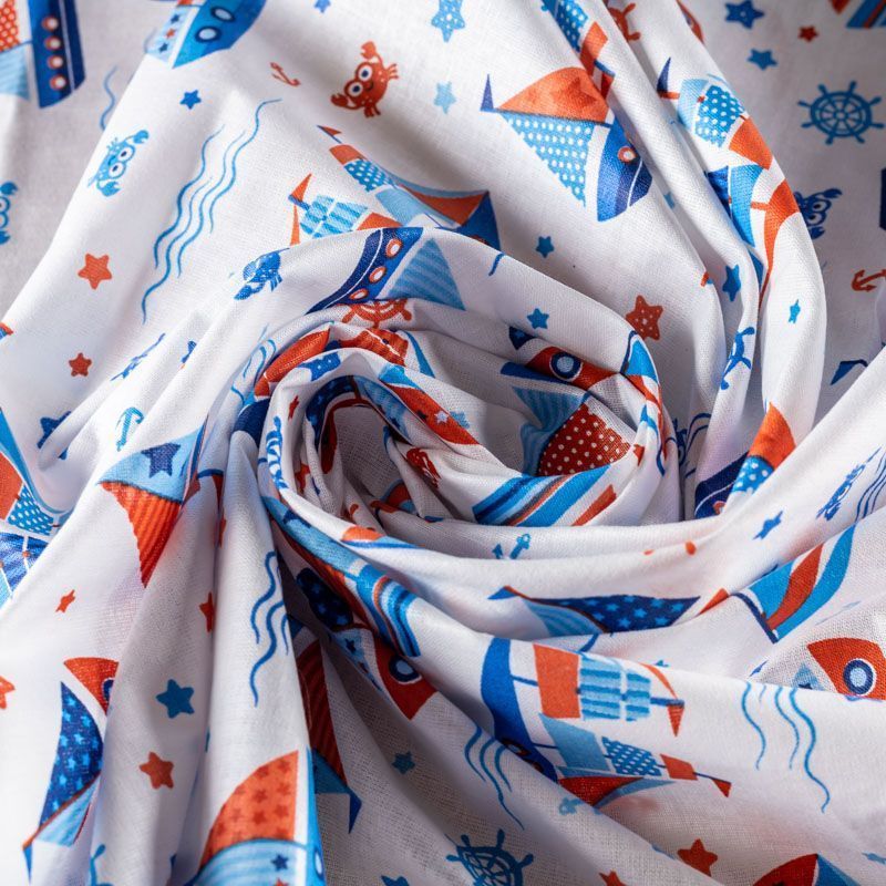 Ткань полотняного переплетения, тонкая, легкая и мягкая. Не вызывает аллергии, дышит и хорошо впитывает влагу. Милый детский принт в морской тематике на белом фоне прекрасно подойдет для пошива детской одежды, нательного белья, халатов и пижам.