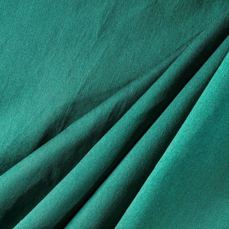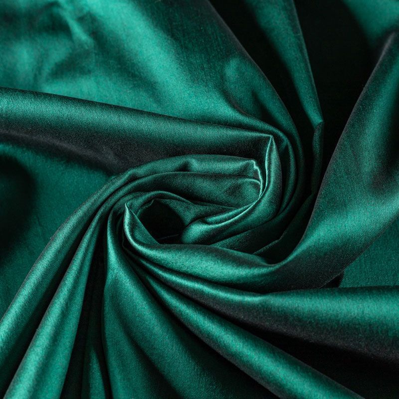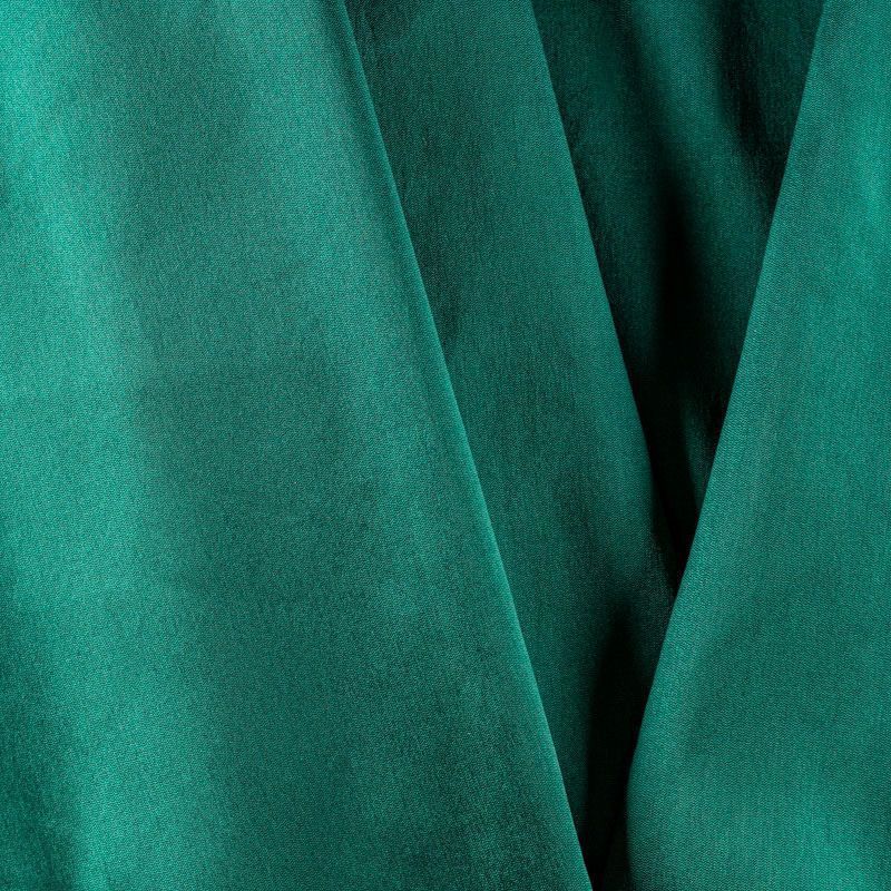 Шелковистая тафта насыщенного зеленого оттенка. Поверность матовая, с благородным шелковым лоском. Полотно средней плотности, легкое, отлично держит форму, драпируется жесткими складками. Хорошо смотрится в платьях с пышными юбками и крупными драпировками, костюмах, корсетах для платья, вечерних и коктельных платьях.