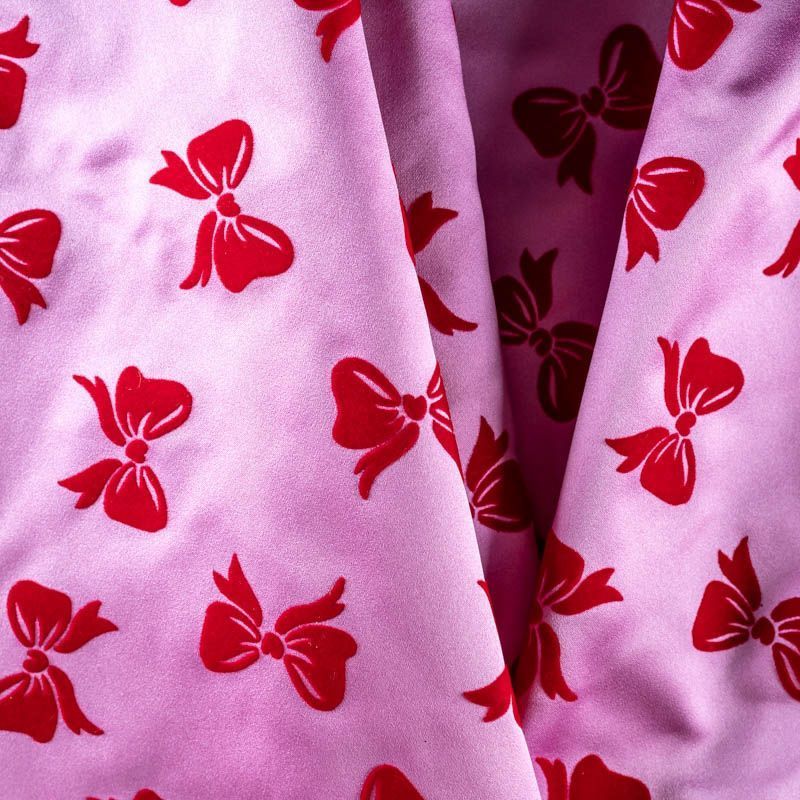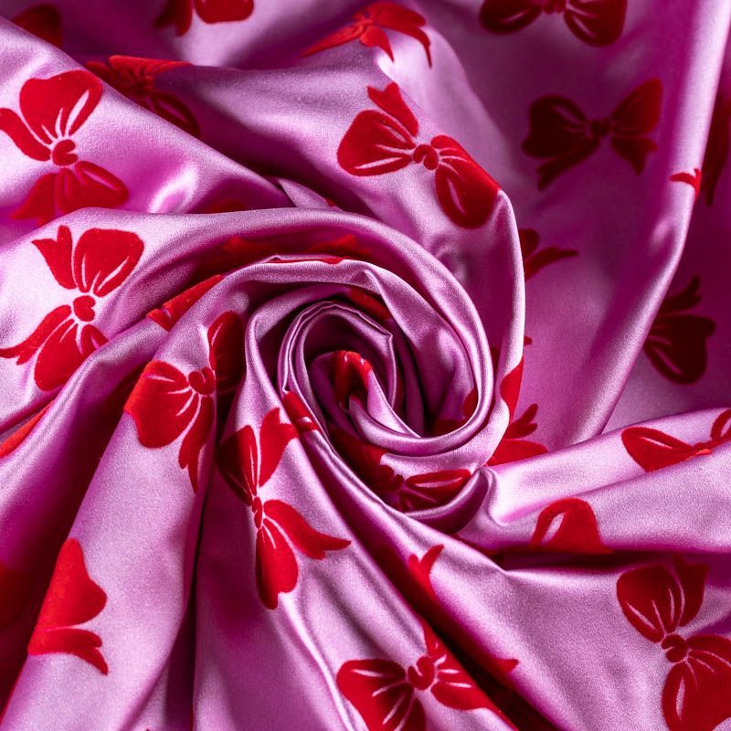 Шелковая тафта цвета фуксии с романтичными банктиками вишневого цвета. Ткань тонкая, но плотная, отлично держит форму, драпируется красивыми жесткими складками и загибами. Фактура гладкая, с матовым блеском. На ощупь приятная, слегка шуршащая. Идеальна для пошива нарядных пышных платьев и юбок, вечерних костюмов, плащей и легких пальто.