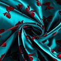 Шелковая тафта насыщенного цвета тиффани с романтичными банктиками вишневого цвета. Ткань тонкая, но плотная, отлично держит форму, драпируется красивыми жесткими складками и загибами. Фактура гладкая, с матовым блеском. На ощупь приятная, слегка шуршащая. Идеальна для пошива нарядных пышных платьев и юбо, вечерних костюмов, плащей и легких пальто.