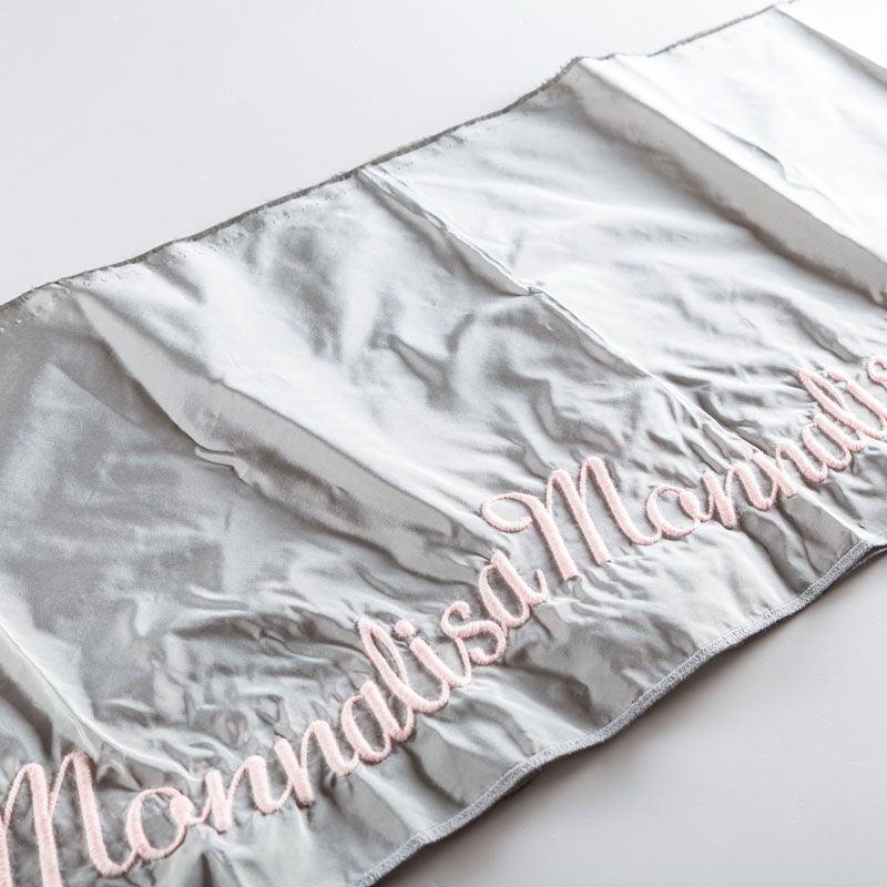 Вышивка на тафте Monnalisa высочайшего качества. Тафта жемчужно-серого оттенка тонкая, но плотная, отлично держит форму, драпируется красивыми жесткими складками и загибами. Фактура гладкая, с матовым блеском. Богатая объемная вышивка логотипа бренда выполнена шерстяной белой нитью идеально. Подойдет как для самостоятельного изделия: юбка, ярусное платье, плащ, парка, так и для декорирования любых изделий: вставка в рукав, оборка, кокетка и т.д.