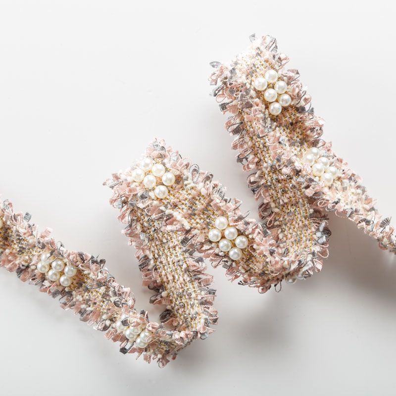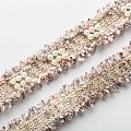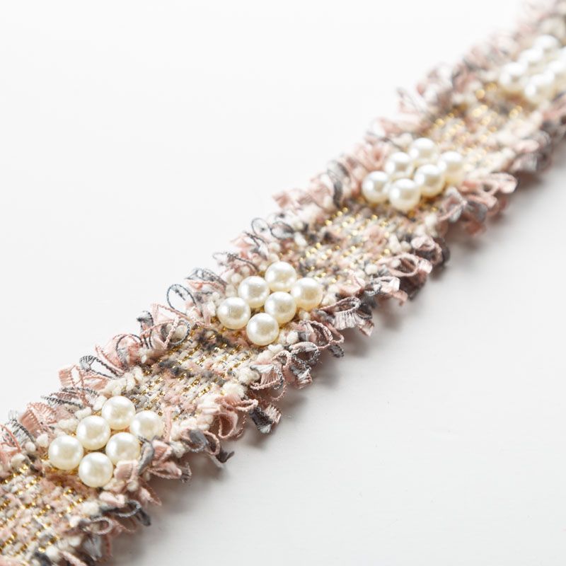 Тесьма декоративная выполнена из бархатистых нитей, прошита люрексом и украшена жемчужными бусинами. Бусины надежно закреплены на тесьме. Подойдет для отделки одежды из твида, букле в стиле Шанель.