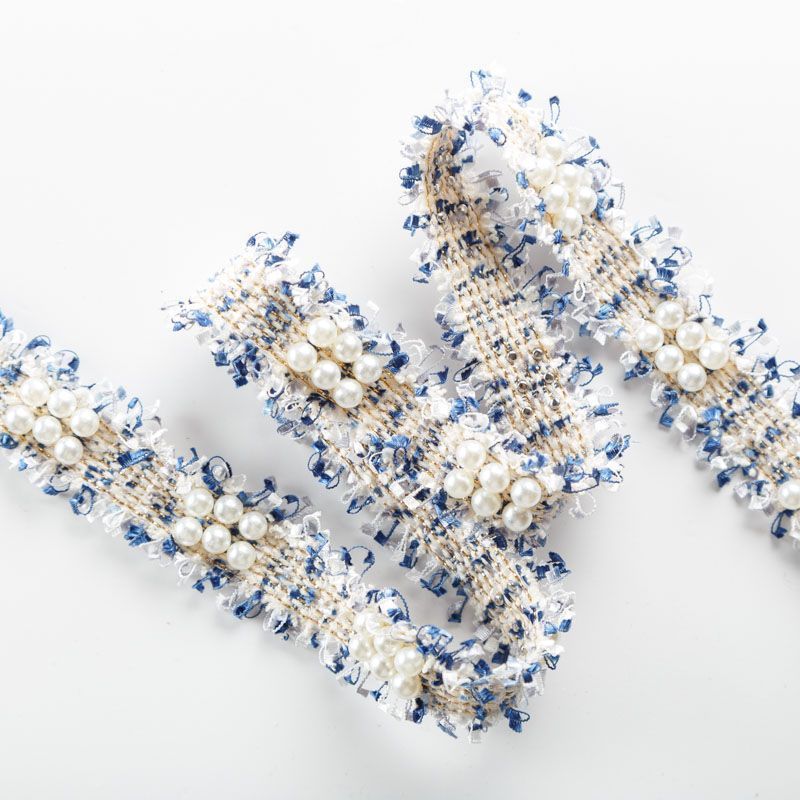 Тесьма декоративная 32 мм с жемчугом 586800 бежевый/синий/золотой