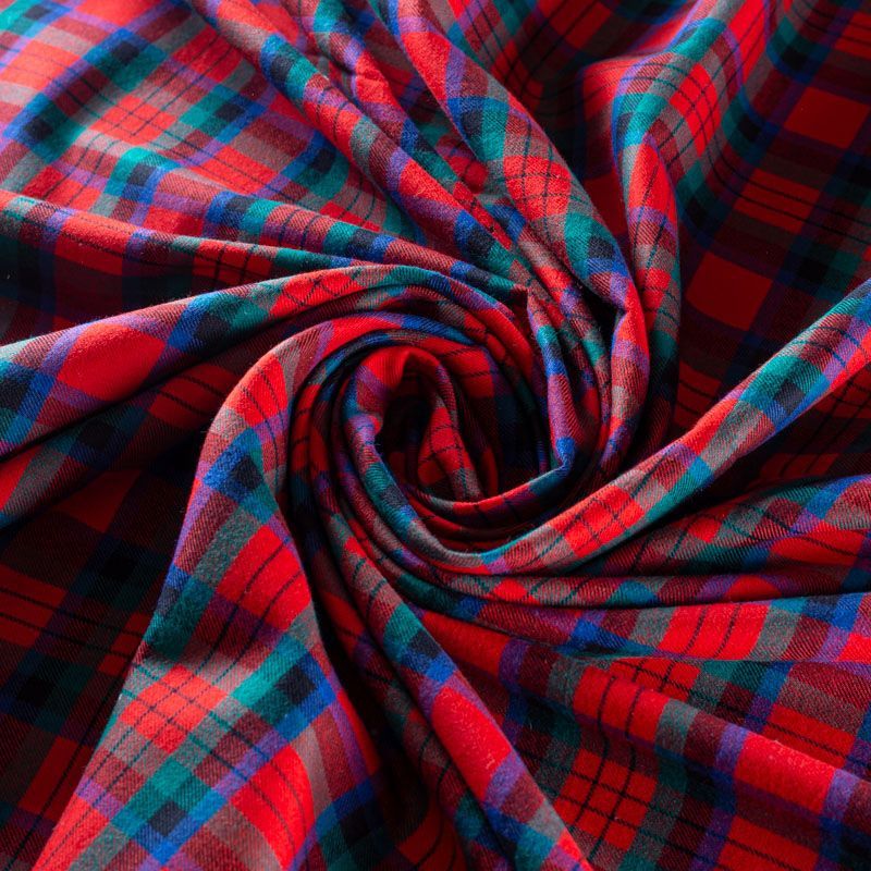 Вискозная костюмная ткань средней плотности, мягкая и приятная на ощупь, немного тянется, формоустойчива, хорошо драпируется и образует мягкие складки. Сочетание линий черного, синег и зеленого цветов на ярком красном фоне образует сложную красивую клетку. Ткань отлично подойдет на костюмы, юбки, брюки, платья, жакеты.