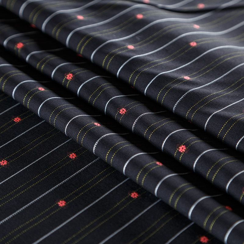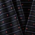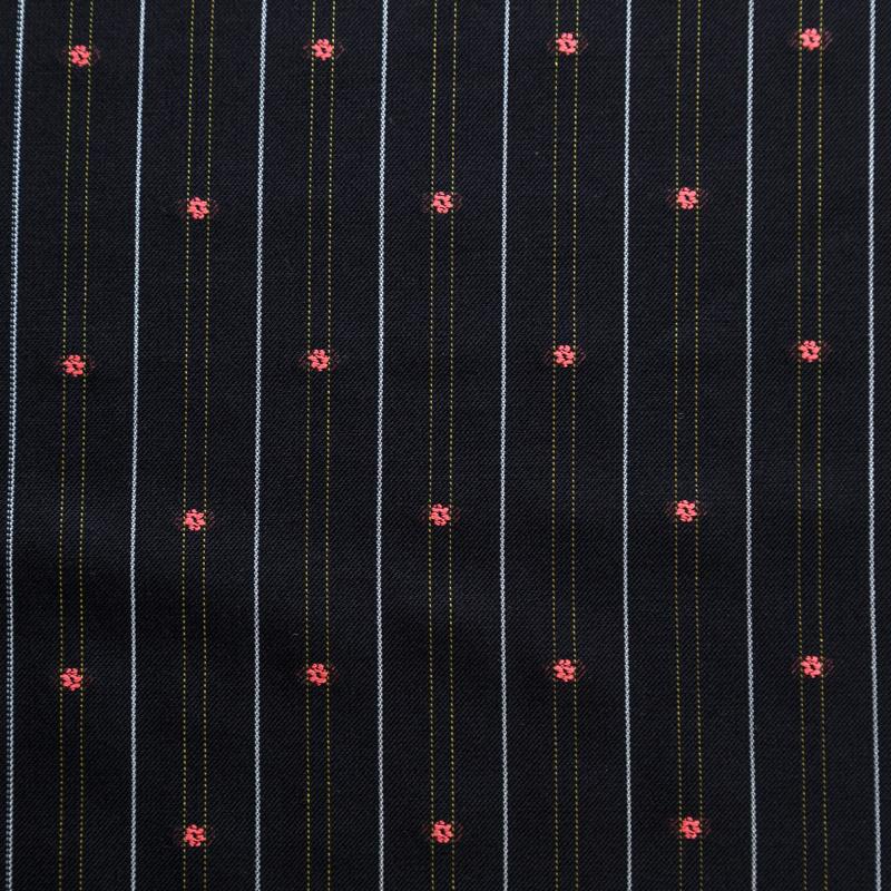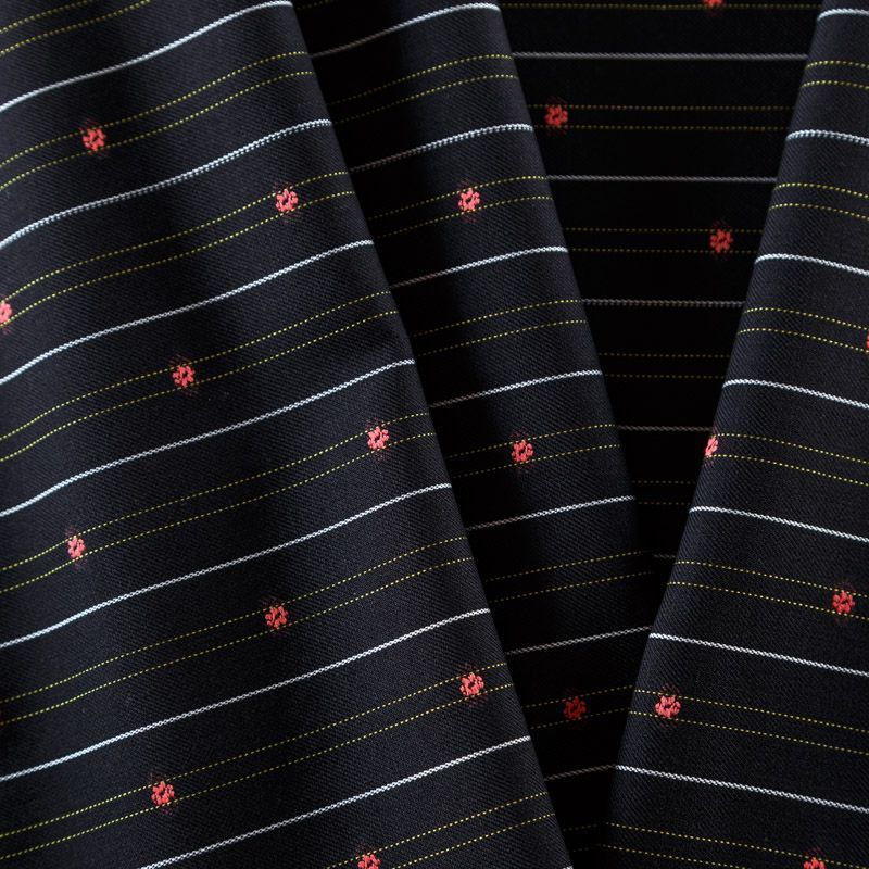Итальяская костюмно-плательная шерстьс хлопком черного цвета в тонкую белую полоску и элементами вышивки. Ткань средней плотности, пластичная, очень приятная на ощупь, драпируется в слегка держащие форму складки, с полотняным переплетением, не тянется. Подойдет для всех видов изделий - платьев, сарафанов, модных жакетов, жилетов, брючных и юбочных костюмов, кюлотов, брюк-палаццо, юбок различных фасонов.