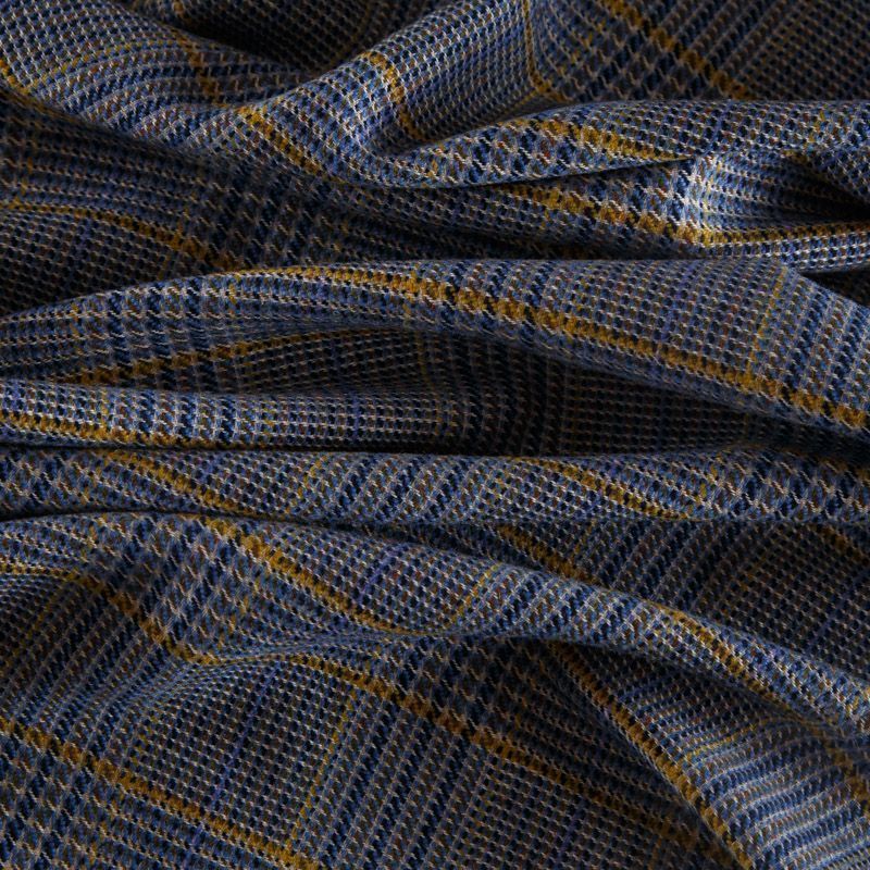 Итальянская костюмно-плательная смесовая шерсть средней плотности, не сухая, пластичная, приятная на ощупь, формоустойчива, не мнется, хорошо драпируется. Красивая клетка тартан образована за счет сочетания полос синего, голубого, желтого и песочного оттенков. Ткань отлично подойдет на костюм, жилет, жакет, легкое пальто, юбку, брюки, плате, сарафан, шорты.