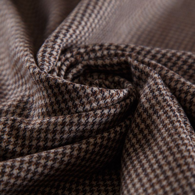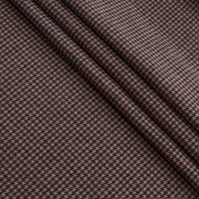 Итальянская костюмно-плательная шерсть средней плотности в бежевом оттенке в мелкую куриную лапку. Ткань не сухая, пластичная, приятная на ощупь, почти не мнется, хорошо драпируется. Ткань отлично подойдет на костюм, жилет, жакет, легкое пальто, юбку, брюки, платье, сарафан, шорты.