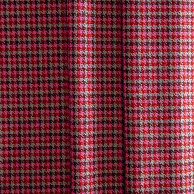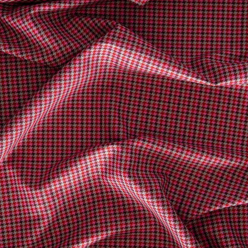 Костюмная ткань с уже классическим узором пье-де-пуль (гусиная лапка) в розово-серых оттенках. Рисунок образован за счёт жаккардового переплетения нитей. Материал мягкий, плотный, благодаря эластану изделия идеально сядут по фигуре и будут очень комфортные. Рекомендуем для пошива костюма, жакета, шорт или юбки.
