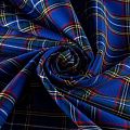 Ткань средней плотности, мягкая и приятная на ощупь, немного тянется, формоустойчива, хорошо драпируется и образует мягкие складки. Сочетание тонких линий желтого, зеленого, красного, черного и белого цветов на ярком васильковом фоне образует сложную красивую клетку тартан. Ткань отлично подойдет на костюмы, юбки, брюки, платья, жакеты.