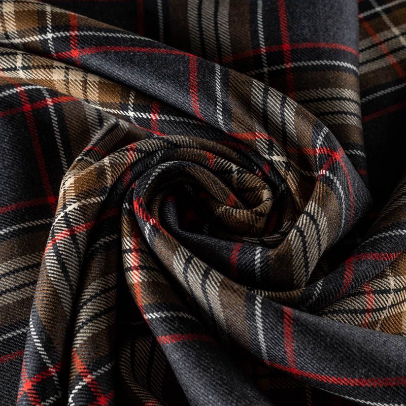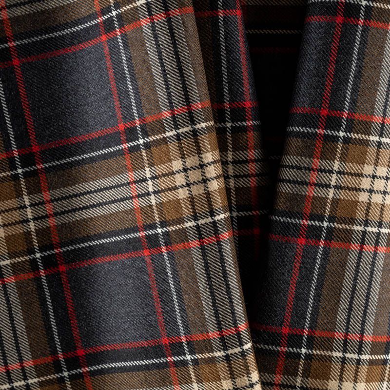 Итальянская шерстяная шотландка - плотная, но легкая и мягкая, приятная на ощупь, немного тянется, хорошо драпируется и образует мягкие складки. Сочетание линий красного, молочного, черного оттенков и цвета хаки образует сложную красивую многоцветную клетку. Ткань отлично подойдет на костюмы, юбки, брюки, платья, жакеты.