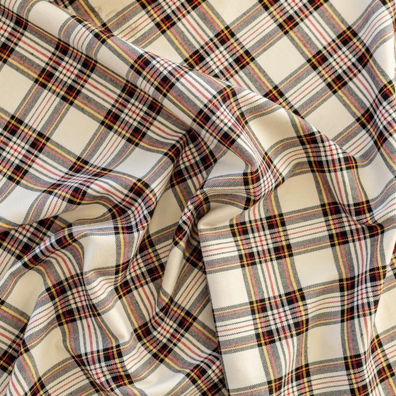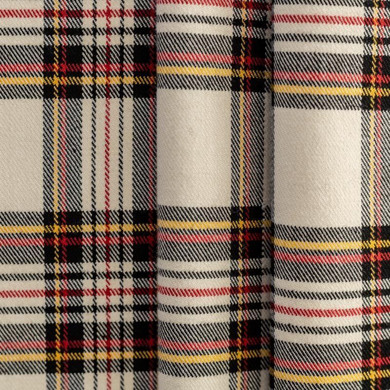 Костюмная шотландка плотная, но легкая и мягкая, приятная на ощупь, немного эластичная, хорошо драпируется и образует мягкие складки. Сочетание линий красного, желтого и черного оттенков образует сложную красивую многоцветную клетку. Ткань отлично подойдет на костюмы, юбки, брюки, платья, жакеты.