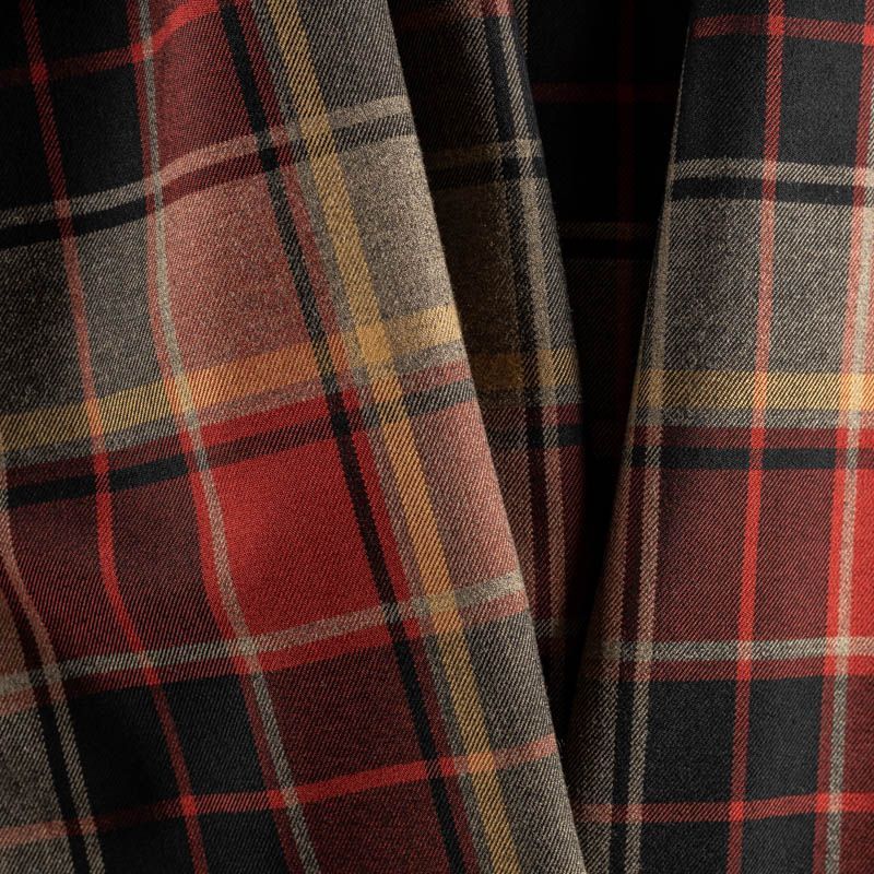 Костюмная шотландка плотная, но не толстая, мягкая и приятная на ощупь, немного тянется, формоустойчива, хорошо драпируется и образует мягкие складки. Сочетание линий красного, черного, терракотового и желтого цветов образует сложную красивую клетку тартан. Ткань отлично подойдет на костюмы, юбки, брюки, платья, жакеты.