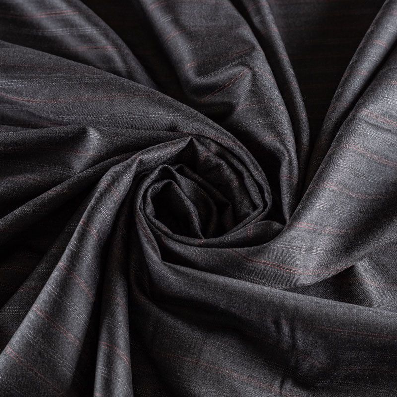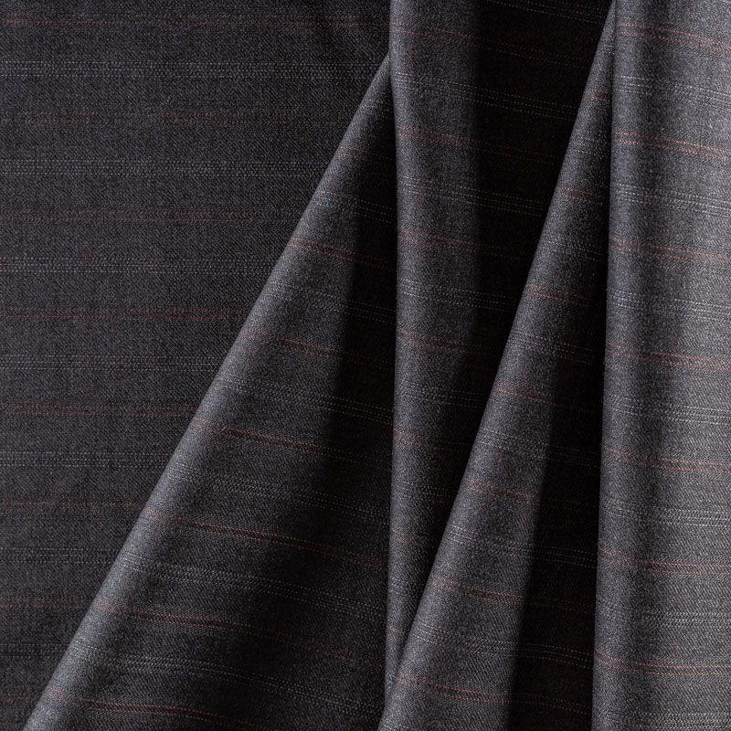 Костюмно-плательная шерстяная ткань средней плотности, немного суховата, приятная на ощупь. На темно-сером фоне очень тонкая жаккардовая полоска серого и бордового оттенка, направление - вдоль кромки. Прекрасно подойдет для пошива брюк-палацио, жакета, платья по фигуре, сарафана, классического мужского или женского костюма.