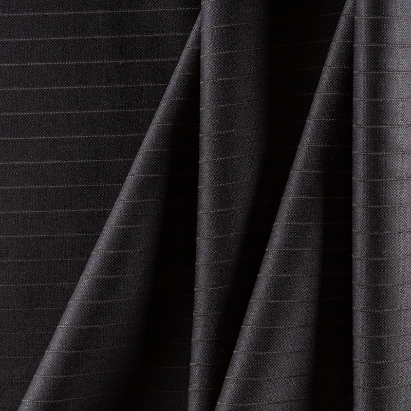 Костюмно-плательная ткань средней плотности, немного суховата, приятная на ощупь. На черном фоне очень тонкая полоска серого оттенка, направление - вдоль кромки. Прекрасно подойдет для пошива брюк-палацио, жакета, платья по фигуре, сарафана, классического мужского или женского костюма.