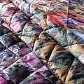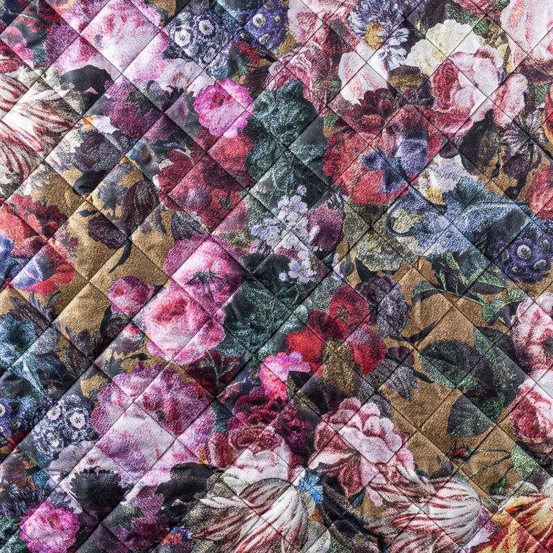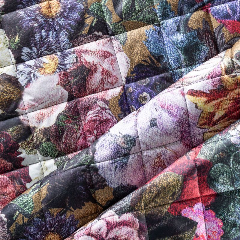 Трехслойная итальянская курточная ткань оттенка хаки с цветочным принтом, простеганная не крупными ромбами размером 3х3 см. Нижний слой черного цвета, заменяет подклад, средний слой - синтепон, верхний слой - красочный матовый полиэстер, напоминащий болонь. Ткань легкая, пластичная, хорошо драпируется и держит форму. Прекрасно подойдет для  пошива легких пальто, курток, бомберов, жилетов, накидок-кейпов, объемных сумок, одежды для домашних питомцев, туристического снаряжения.