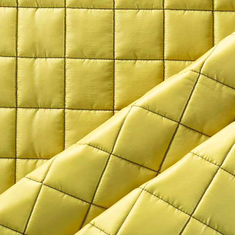 Трехслойная итальянская курточная ткань желто-зеленого оттенка, простеганная не крупными квадратами. Нижний слой черного цвета, заменяет подклад, средний слой - синтепон, верхний слой - матовый полиэстер, напоминающий болонь. Ткань легкая, пластичная, хорошо держит форму. Прекрасно подойдет для  пошива легких пальто, курток, бомберов, жилетов, накидок-кейпов, объемных сумок, одежды для домашних питомцев, туристического снаряжения.