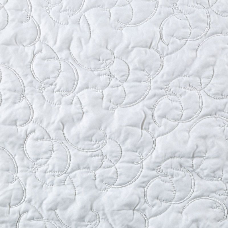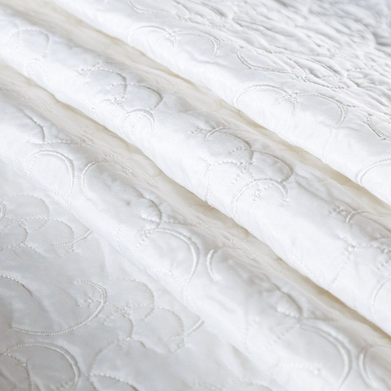 Двухслойная курточная ткань молочного оттенка, с абстрактной стежкой нитками в тон полотну. Нижний слой - синтепон, верхний -  полиэстер, по качеству напоминает болонь. Ткань легкая, пластичная, хорошо драпируется. Прекрасно подойдет для  пошива пальто, курток, жилетов, накидок-кейпов, объемных сумок, одежды для домашних питомцев, туристического снаряжения.