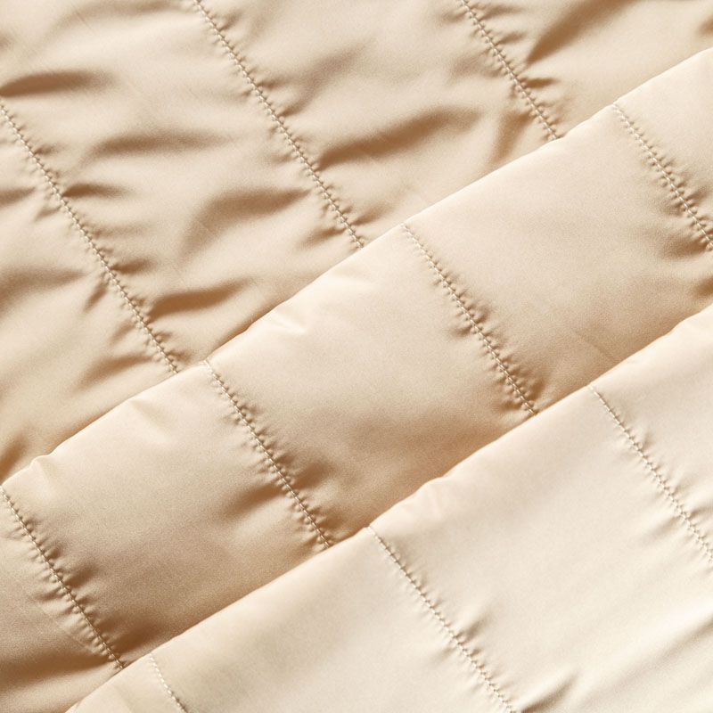 Итальяская двухслойная курточная ткань песочного оттенка, простеганная широкими полосами вдоль кромки. Нижний слой - воздушный синтепоновый утеплитель, верхний - матовая плотная плащевая ткань. Очень мягкая и легкая, пластичная, хорошо драпируется. Прекрасно подойдет для  пошива легких пальто, бомберов, парки, курток, жилетов, накидок-кейпов, объемных сумок.