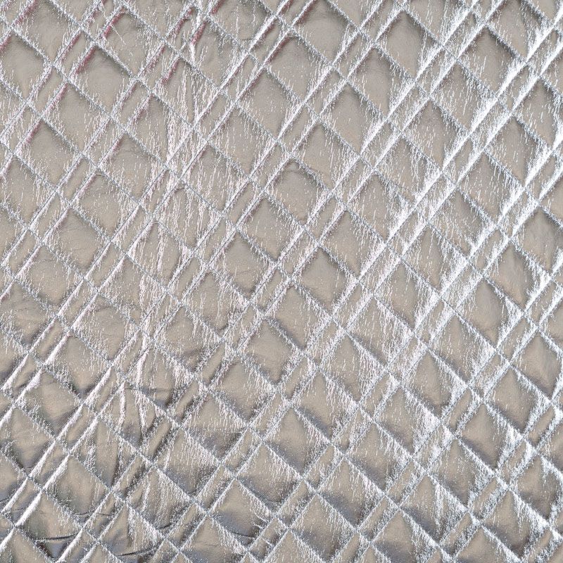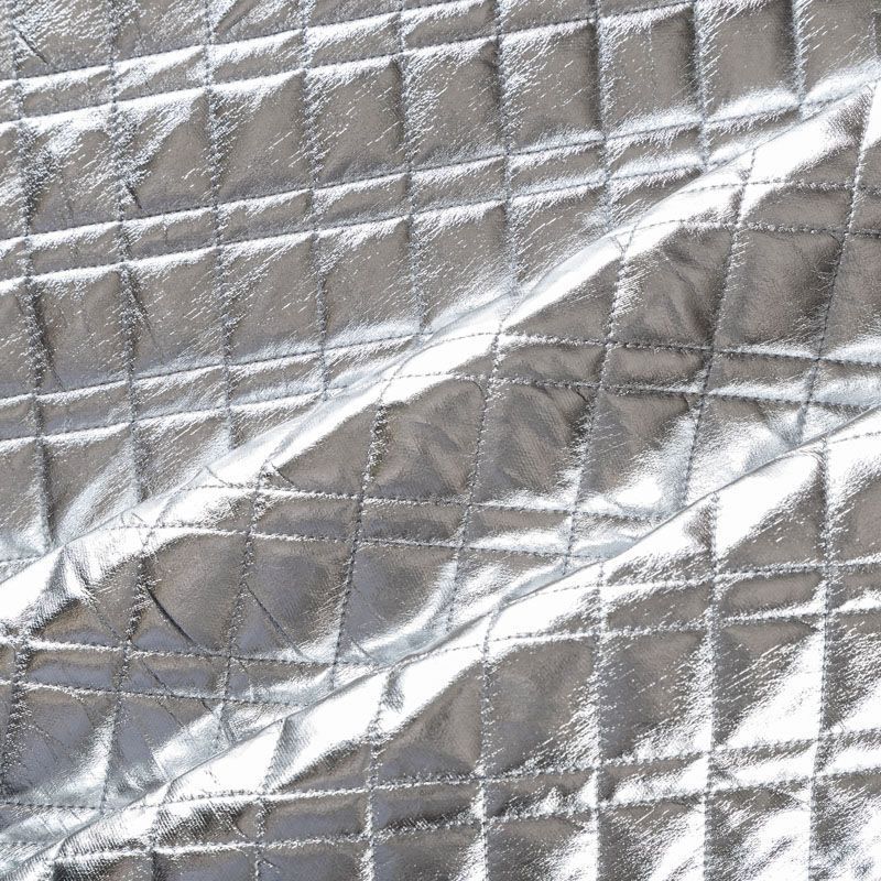 Трехслойная курточная стежка серебристого цвета с блеском, простеганная не крупными ромбами и прямоугольниками. Верхний слой - полиэстер на трикотажной основе, имитирующий кожу, средний - синтепон, нижний слой - подкладочная ткань в тон лицевой.  Очень мягкая и легкая, пластичная, хорошо драпируется. Прекрасно подойдет для  пошива легких пальто, курток, жилетов, накидок-кейпов, объемных сумок.