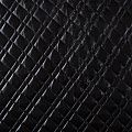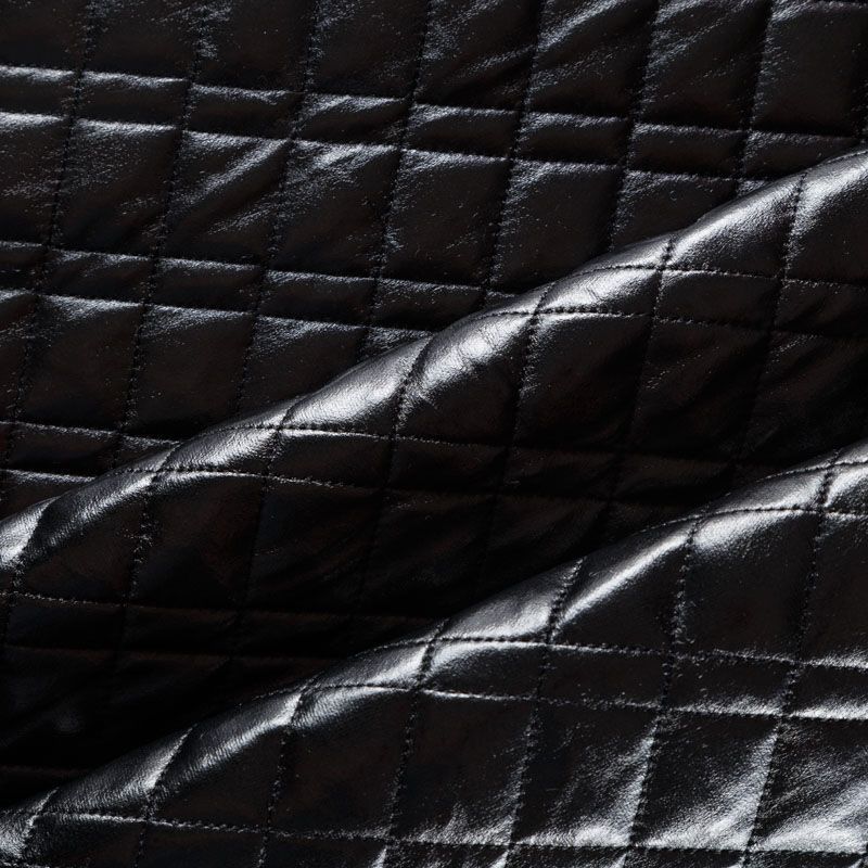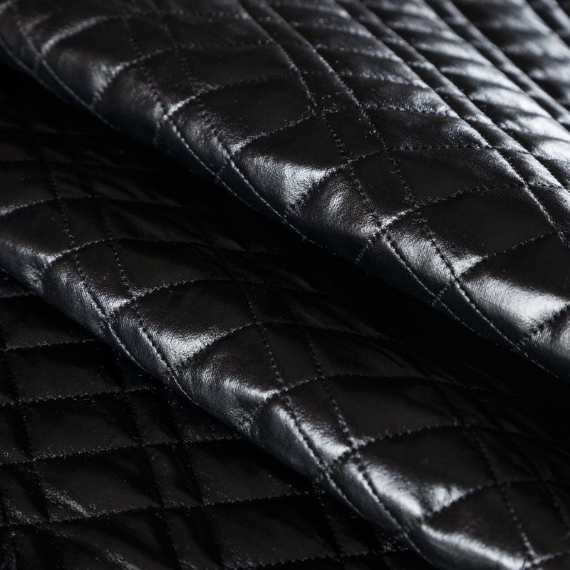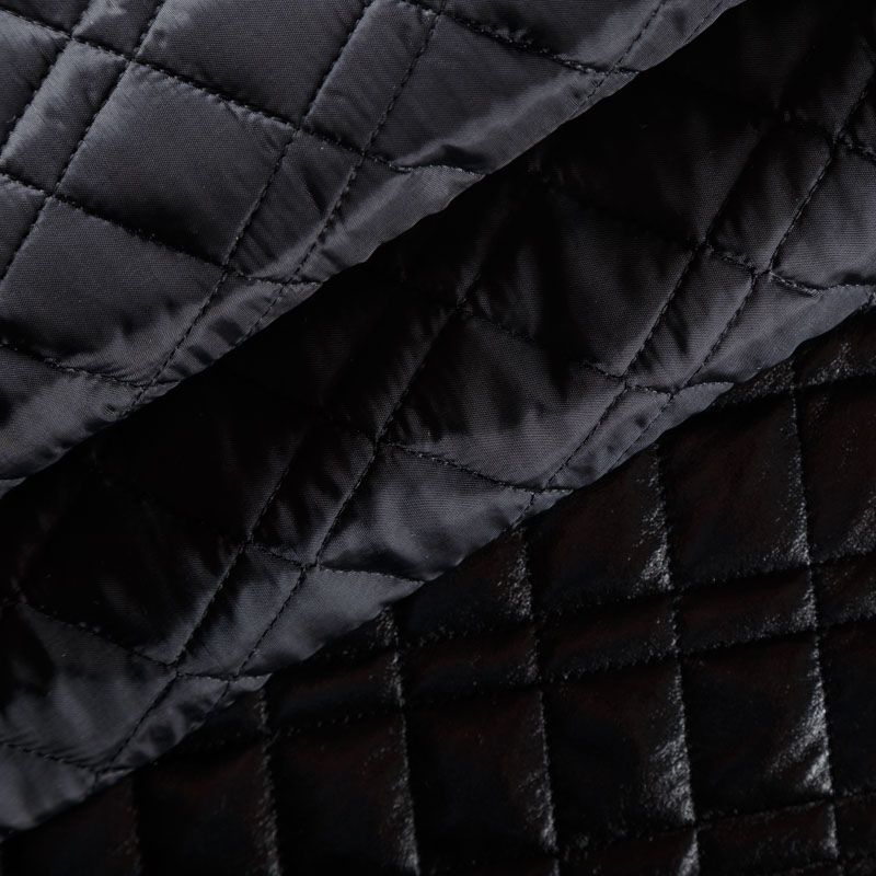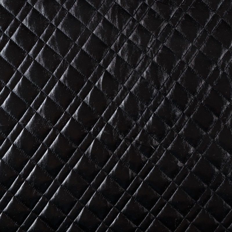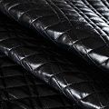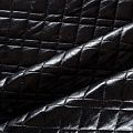 Трехслойная курточная стежка черного цвета с блеском, простеганная не крупными ромбами и прямоугольниками. Верхний слой - полиэстер на трикотажной основе, имитирующий кожу, средний - синтепон, нижний слой - подкладочная ткань в тон лицевой.  Очень мягкая и легкая, пластичная, хорошо драпируется. Прекрасно подойдет для  пошива легких пальто, курток, жилетов, накидок-кейпов, объемных сумок.
