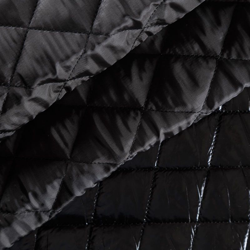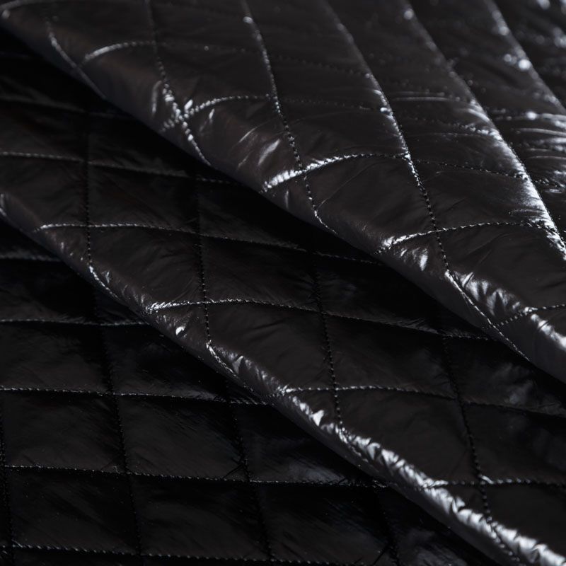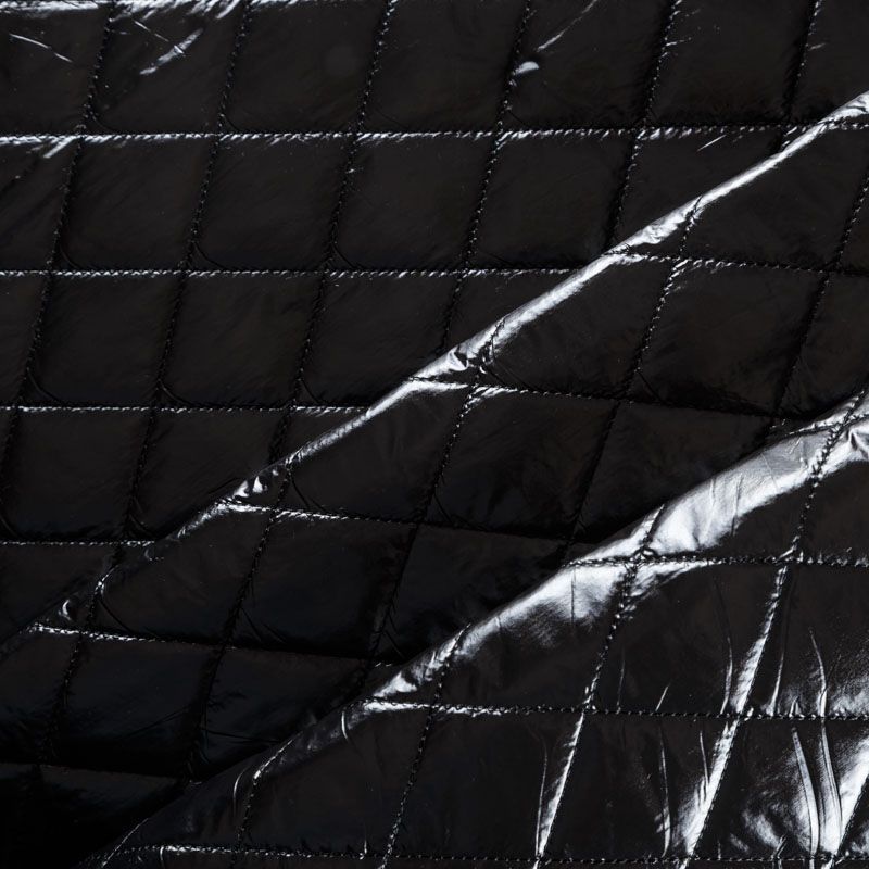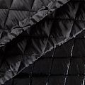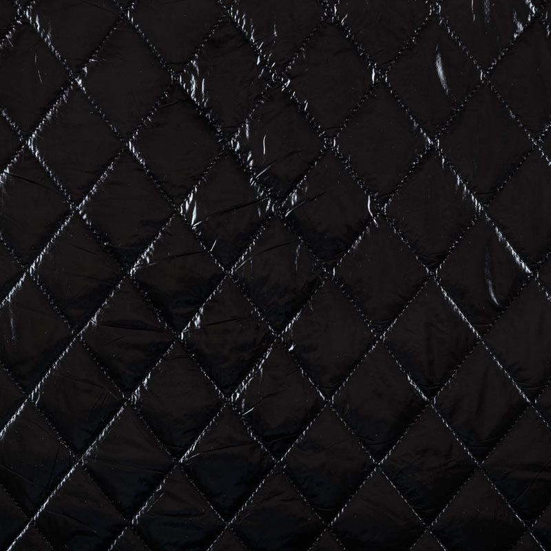Трехслойная курточная стежка черного цвета, простеганная не крупными ромбами. Верхний  слой - полиэстер, по качеству напоминающий болонь, средний слой - синтепон, нижний слой - подкладочная ткань в тон лицевой. Очень мягкая и легкая, пластичная, хорошо драпируется. Прекрасно подойдет для  пошива легких пальто, курток, жилетов, накидок-кейпов, объемных сумок.