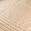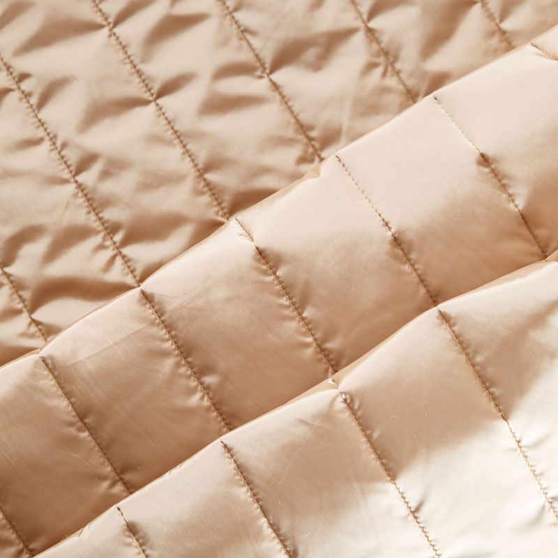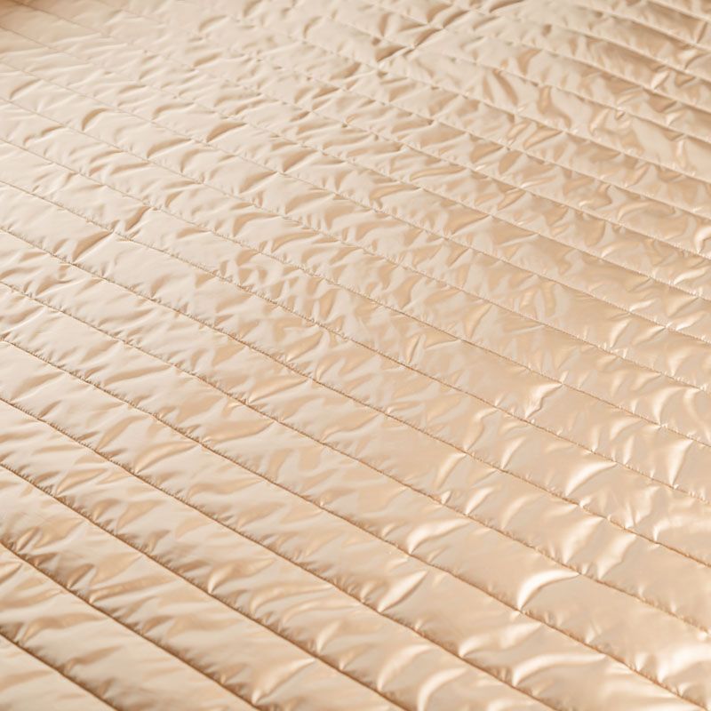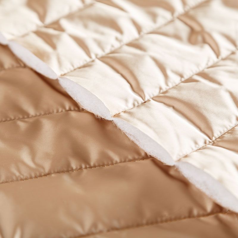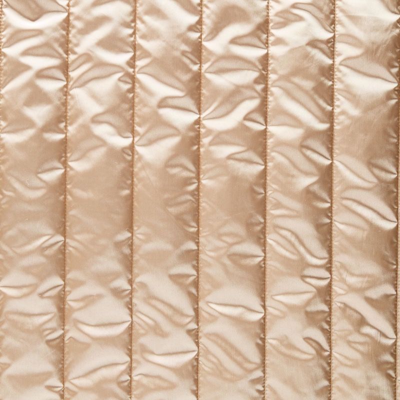 Итальяская трехслойная двухсторонняя курточная ткань бежевого оттенка, простеганная широкими полосами вдоль кромки. Средний слой - воздушный синтепоновый утеплитель, нижний и верхний - матовая плотная плащевая ткань. Очень мягкая и легкая, пластичная, хорошо драпируется. Прекрасно подойдет для  пошива легких пальто, бомберов, парки, курток, жилетов, накидок-кейпов, объемных сумок.