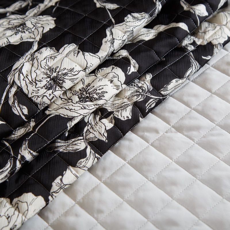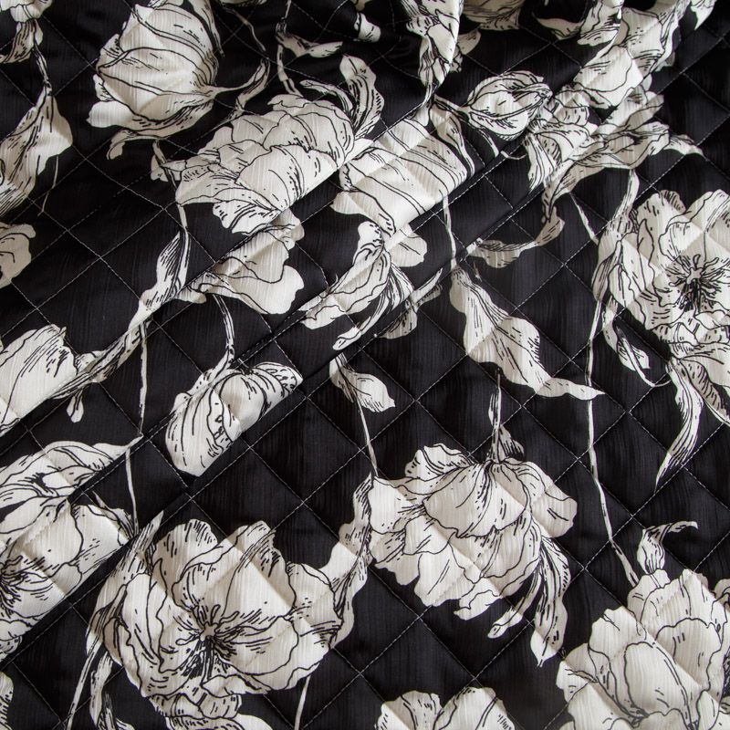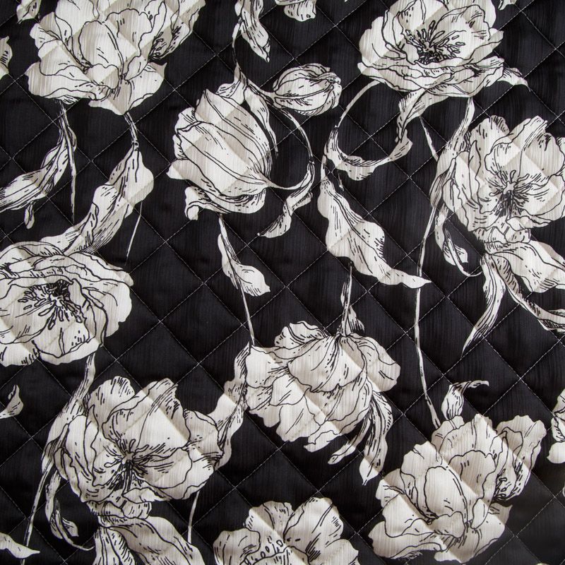 Итальянская трехслойная курточная ткань черного цвета с контрастным цветочным принтом, простеганная ромбами. Нижний слой - гладкий матовый полиэстер белого цвета, средний слой - синтепон, верхний - принтованный креп-шифон. Очень мягкая и легкая, пластичная, хорошо драпируется. Прекрасно подойдет для  пошива легких пальто, бомберов, парки, курток, жилетов, накидок-кейпов, объемных сумок.
