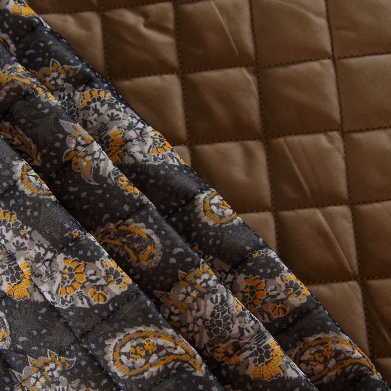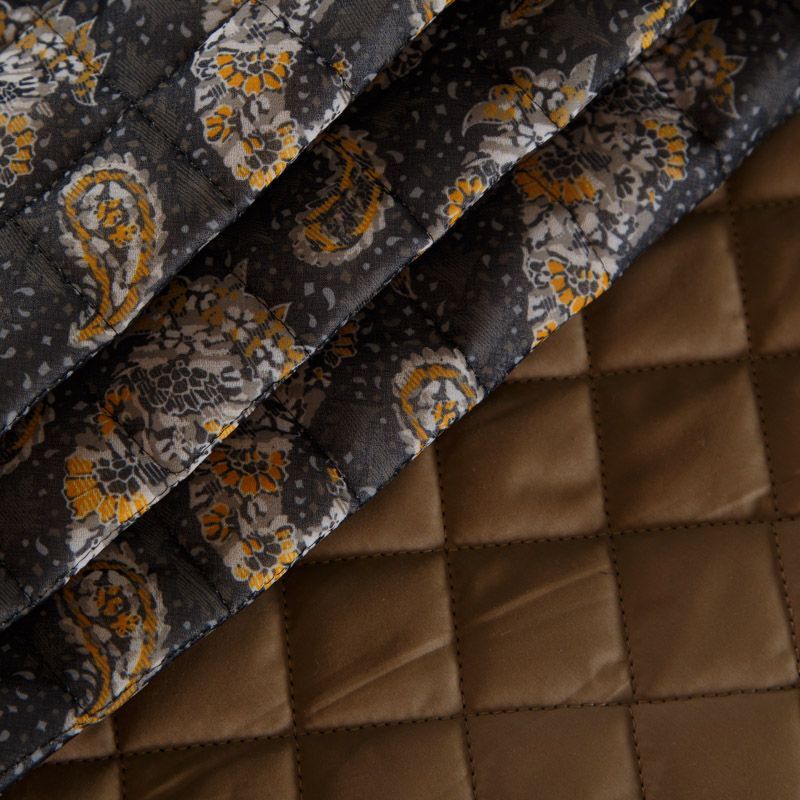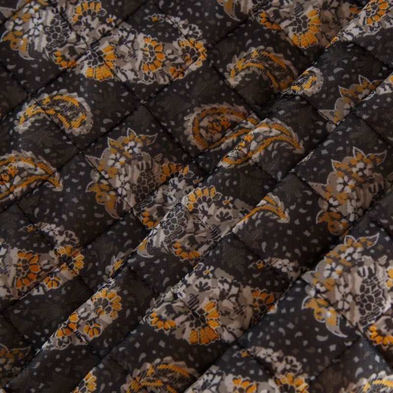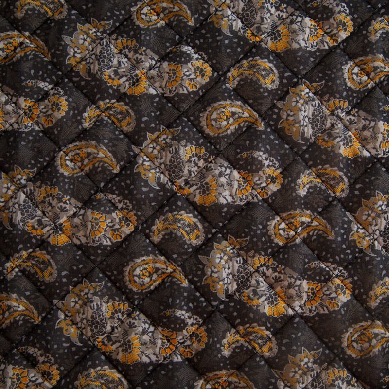 Итальянская трехслойная курточная ткань графитового цвета с контрастным принтом пейсли, простеганная ромбами. Нижний слой - гладкий матовый полиэстер коричневого цвета, средний слой - синтепон, верхний - принтованный креп-шифон. Очень мягкая и легкая, пластичная, хорошо драпируется. Прекрасно подойдет для  пошива легких пальто, бомберов, парки, курток, жилетов, накидок-кейпов, объемных сумок.