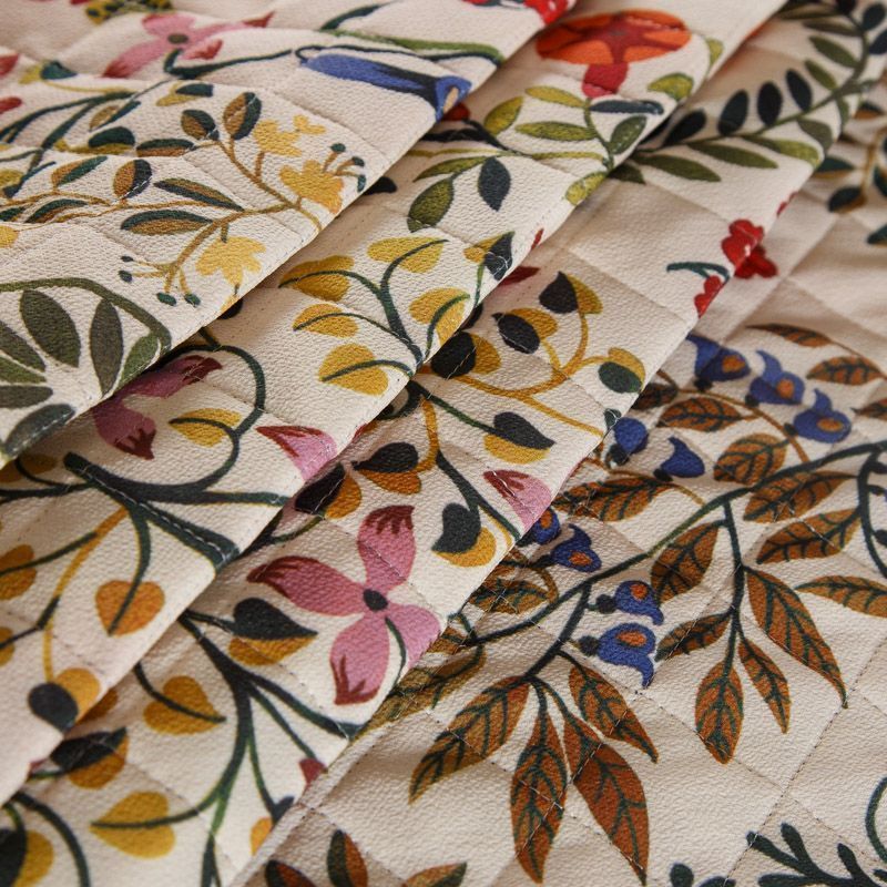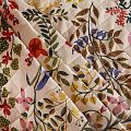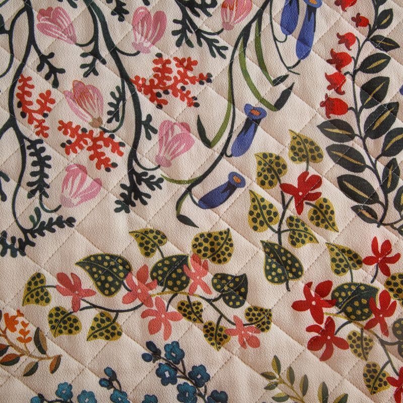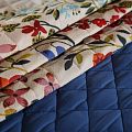 Итальянская трехслойная курточная ткань насыщенного молочного цвета с ярким принтом, простеганная ромбами. Нижний слой - гладкий матовый полиэстер синего цвета, средний слой - синтепон, верхний - принтованный креп-шифон. Очень мягкая и легкая, пластичная, хорошо драпируется. Прекрасно подойдет для  пошива легких пальто, бомберов, парки, курток, жилетов, накидок-кейпов, объемных сумок.