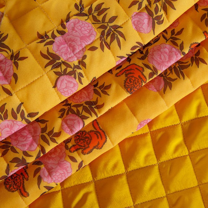 Итальянская трехслойная курточная ткань насыщенного желтого цвета с ярким принтом, простеганная ромбами. Нижний слой - подкладочная ткань желтого цвета, средний слой - синтепон, верхний - принтованный креп-шифон. Очень мягкая и легкая, пластичная, хорошо драпируется. Прекрасно подойдет для  пошива легких пальто, бомберов, парки, курток, жилетов, накидок-кейпов, объемных сумок.