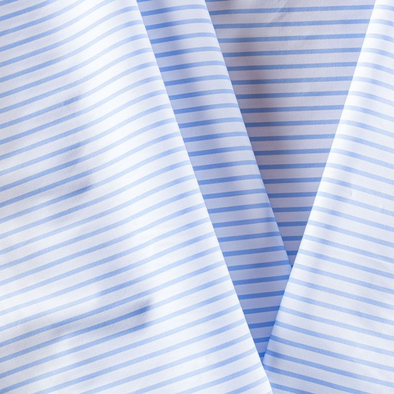 Итальянский плательно-рубашечный хлопок в бело-голубую полоску средней ширины. Ткань мягкая, лёгкая, непрозрачная, пластичная и приятная к телу, хорошо драпируется, имеет гладкую матовую поверхность и сатиновое плетение. Прекрасно подойдет как для пошива платья-рубашки, сарафана, платьев различных фасонов, туники, топа, летнего костюма, комбинезона.